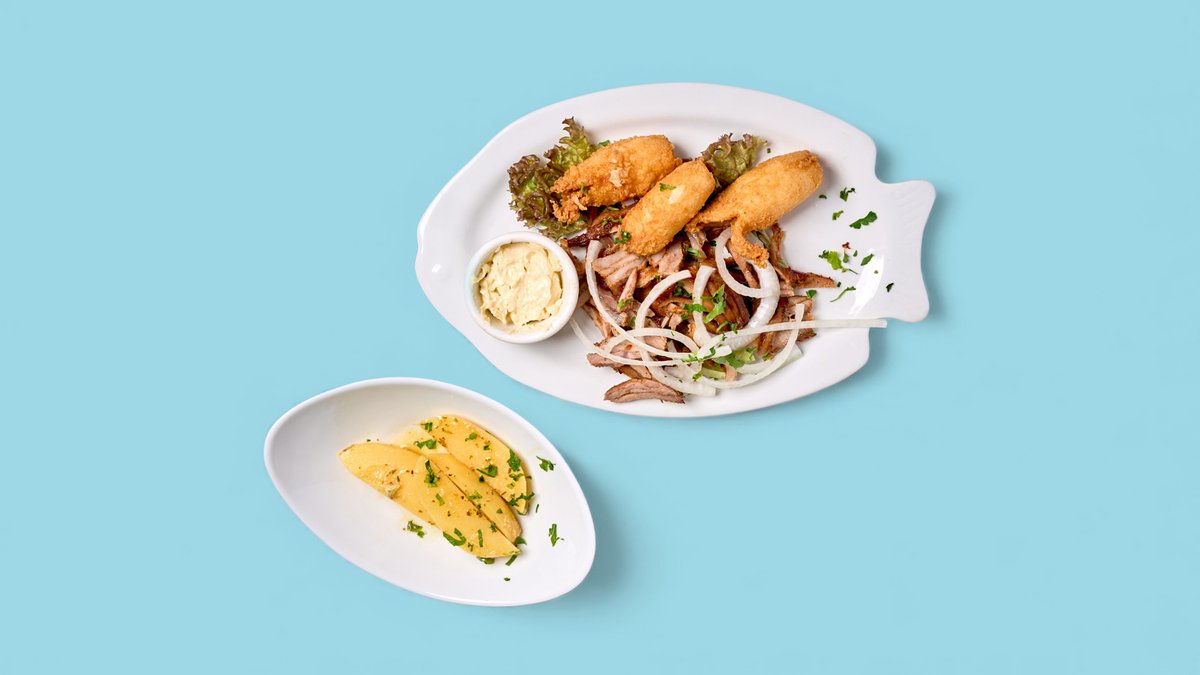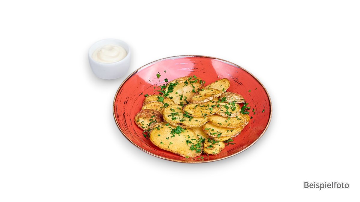 alle Gerichte werden mit gemischtem Salat, Kartoffeln und Zitrone-Knoblauchsoße
