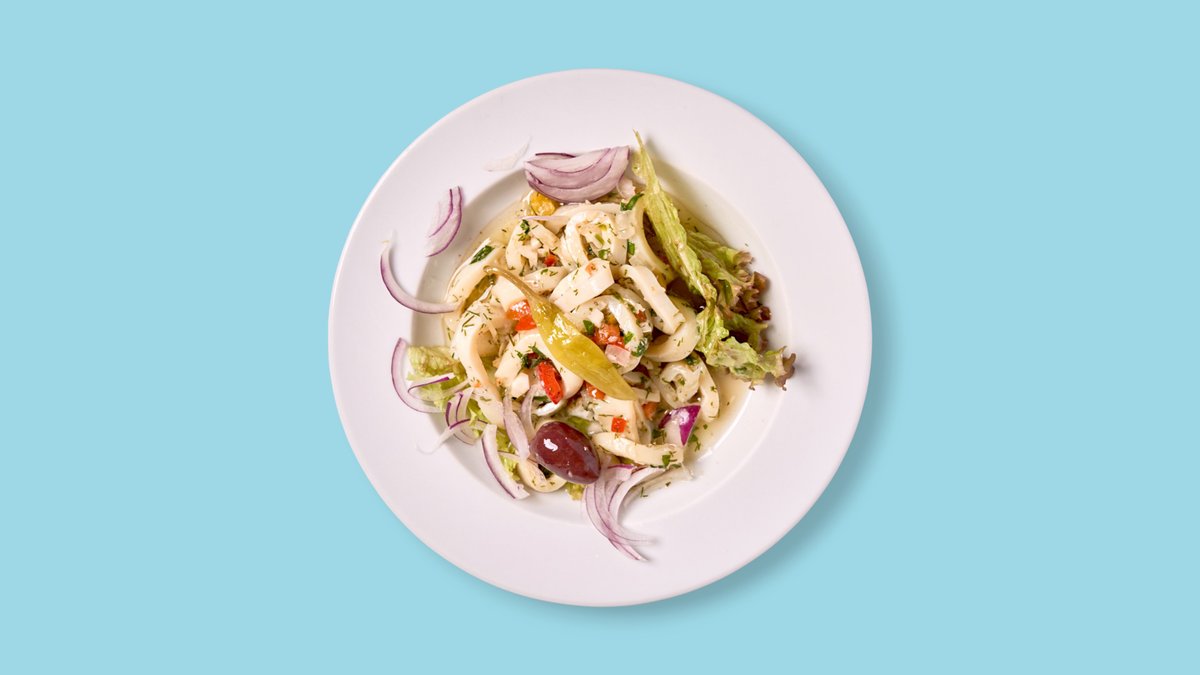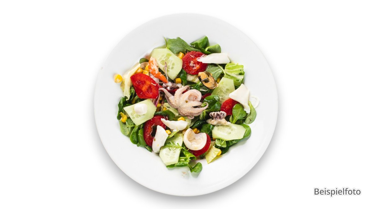 mit Eisberg, Thunfisch, Tomaten, Gurken, Oliven, Paprika und Olivenöl