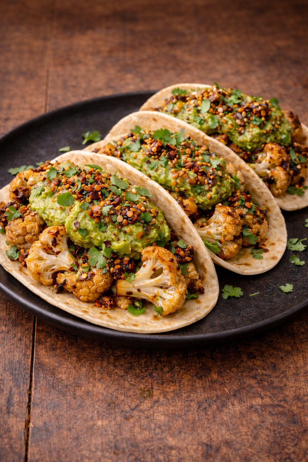 Gerösteter Blumenkohl, Salsa Macha mit Erdnüssen und Chili, Guacamole, Knoblauch, Koriander