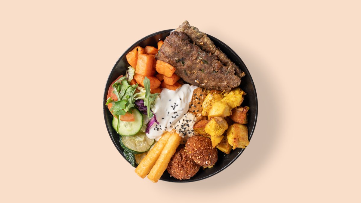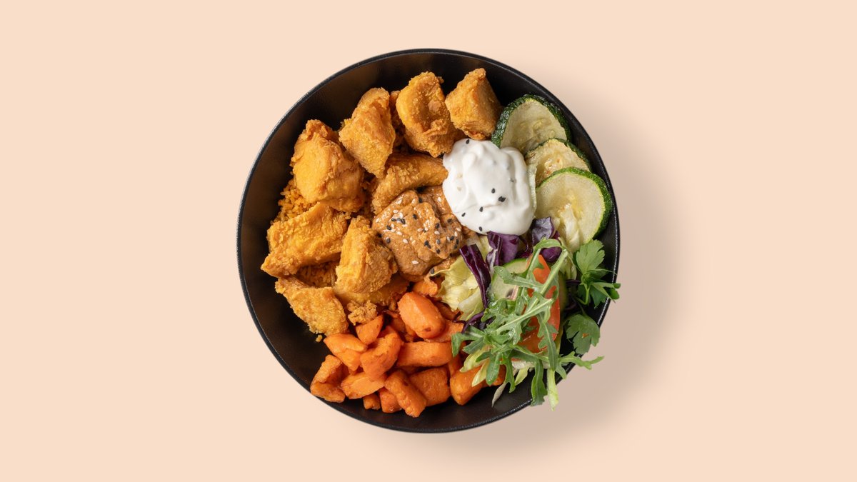 alle Bowls werden mit Salat, Reis und Joghurt-Dip serviert („Vegan Bowl” wird ohne Joghurt-Dip serviert )