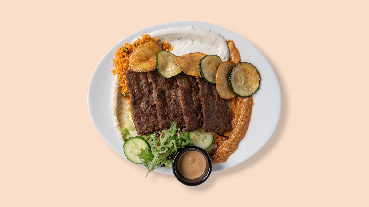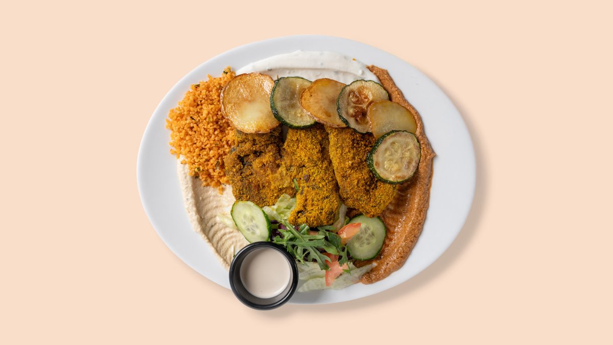 alle Gerichte werden mit Auberginenpaste, Zucchinischeiben, Kartoffelscheiben, Bulgur, Salat, Joghurt-Dip und einer Soße deiner Wahl zubereitet („Khartoum-Teller“ und „Vegan Teller“ werden ohne Joghurt-Dip zubereitet, und „Ibras Fisch-Teller“ wird ohne Auberginenpaste und einer Soße deiner Wahl zubereitet)
