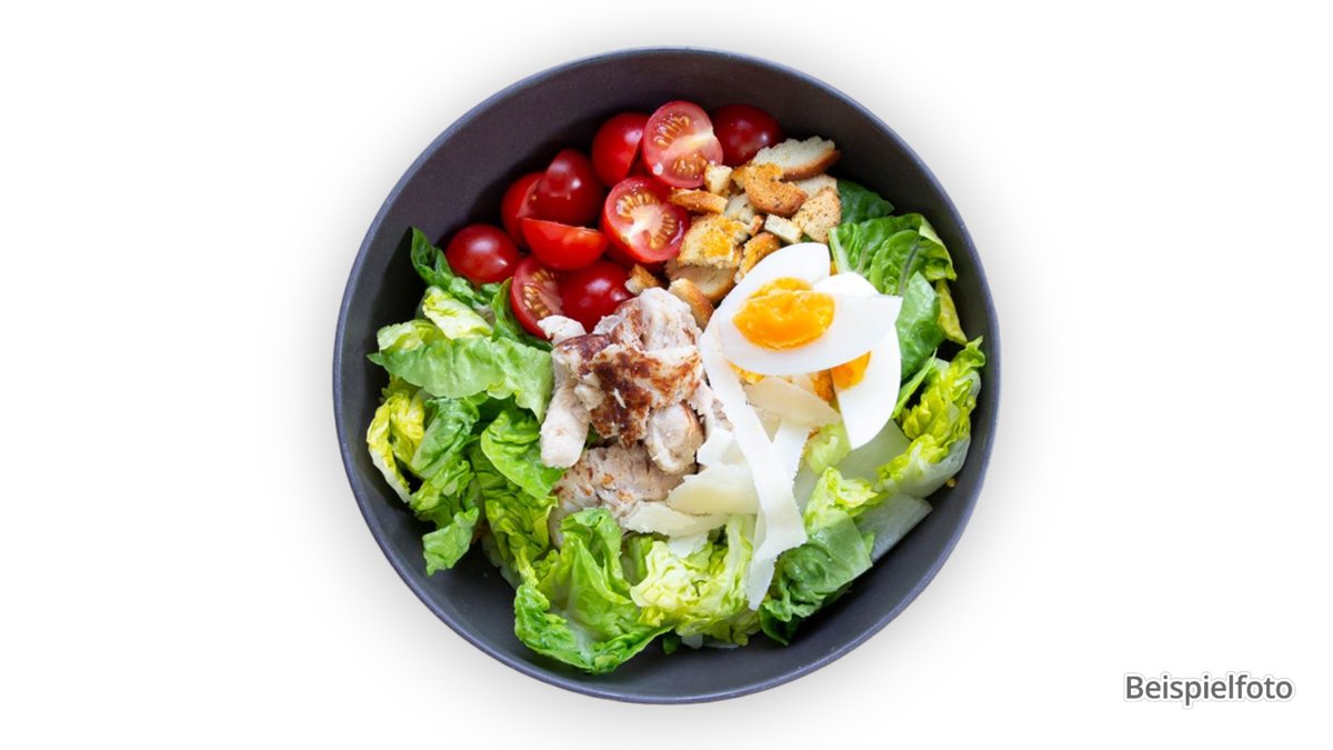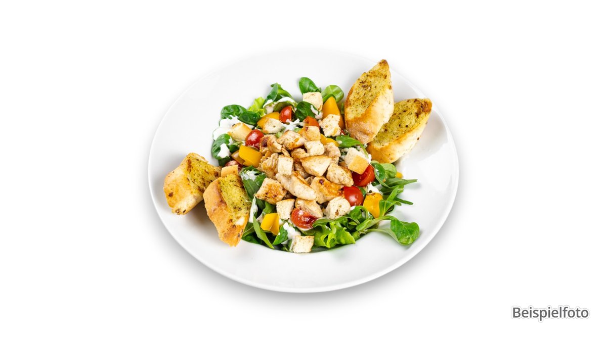 mit Hähnchenfleisch, Grana Padano, Kirschtomaten, Croutons und Caesar-Dressing