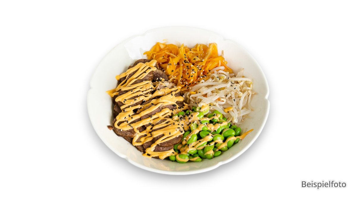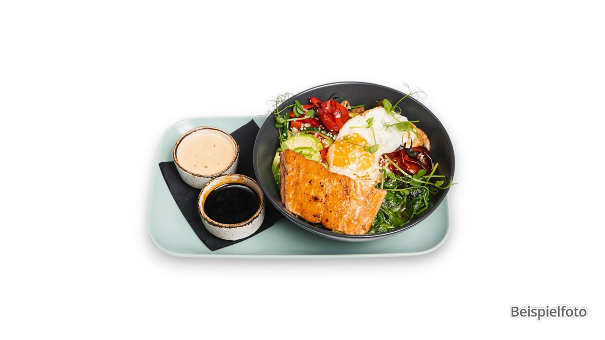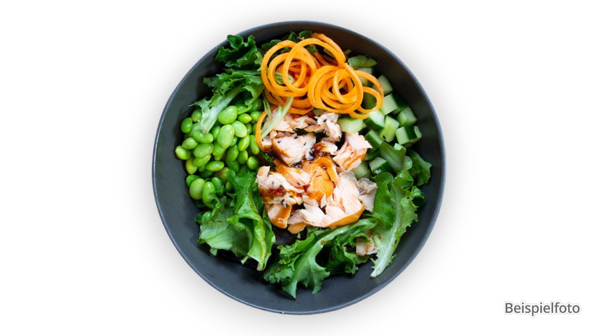 mit gezupftem Lachs, Teriyaki-Soße, Edamame, Gurken, Karottenspirelli, schwarzem Sesam und geröstetem Sesam-Dressing