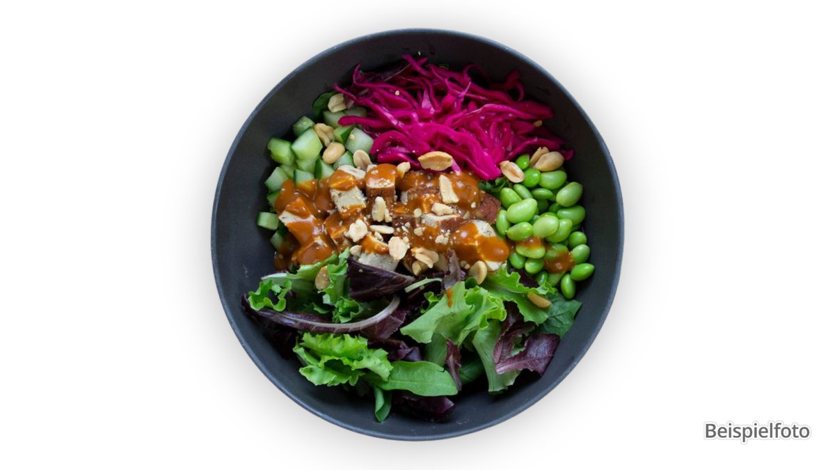 mit Mandel-Sesam-Tofu, Sate-Soße, Edamame, eingelegtem Rotkohl, Gurken, gehackten Erdnüssen und geröstetem Sesam-Dressing