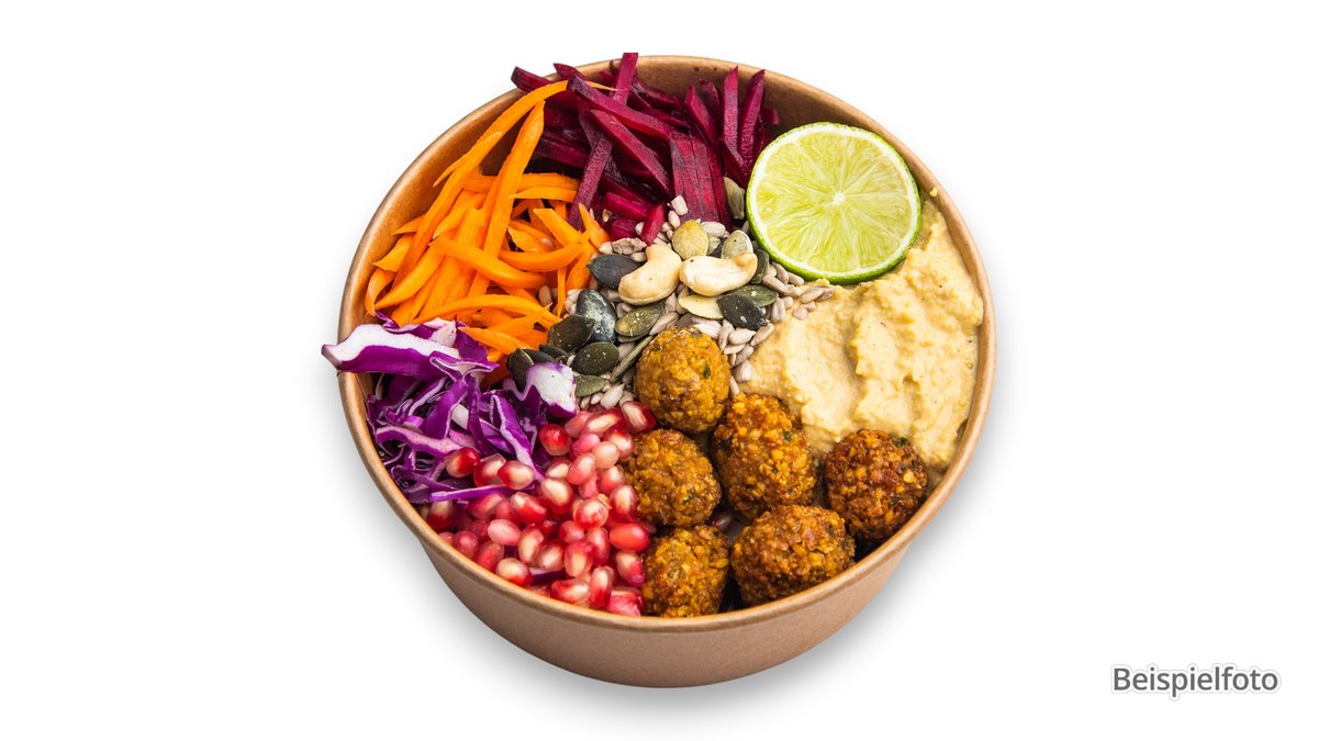 mit Falafelbällchen, veganem Dressing, Avocado, Karottenspirelli, Carpaccio-Rote Beete, gerösteten Erbsen und fruchtigem Sesam-Rote-Beete-Dressing