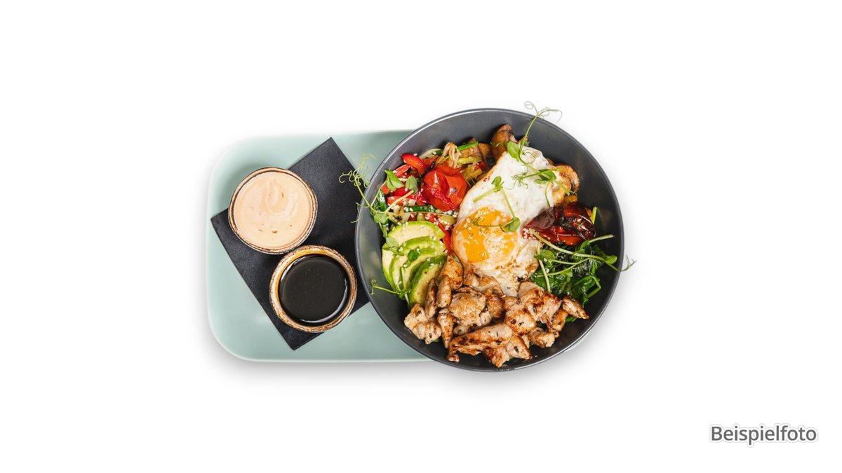 alle Bowls werden mit Kartoffelstampf, Gouda, Röstzwiebeln und Salat-Mix zubereitet („Make your own Kartoffel Bowl“ wird mit einer Basis deiner Wahl zubereitet und „Julius Caesar Bowl“ mit Romanasalat)