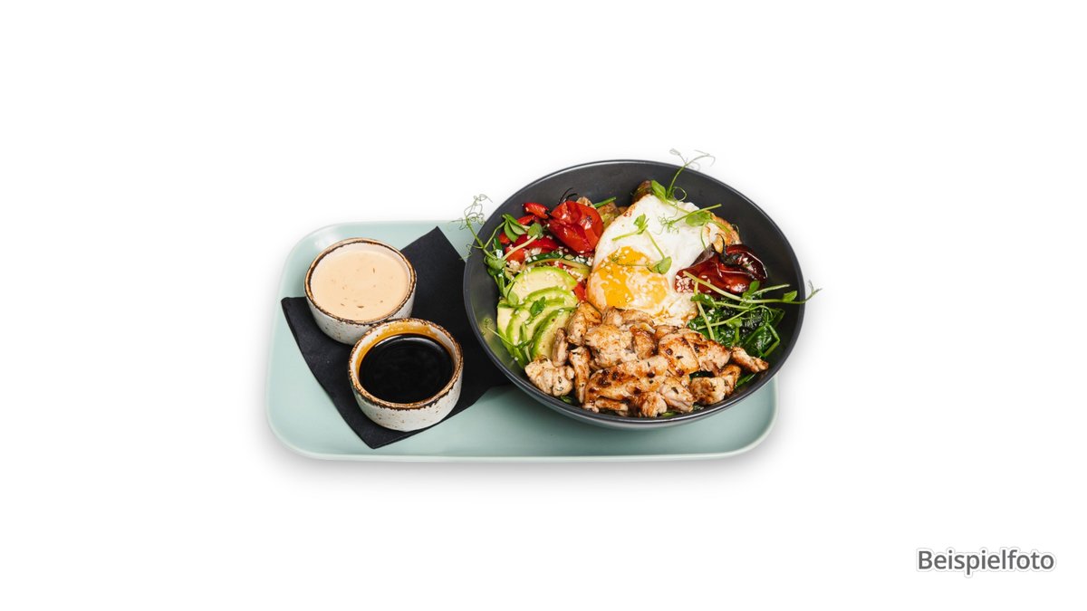 mit Hähnchen, Teriyaki-Soße, Karotten, Gurken und geröstetem Sesam-Dressing