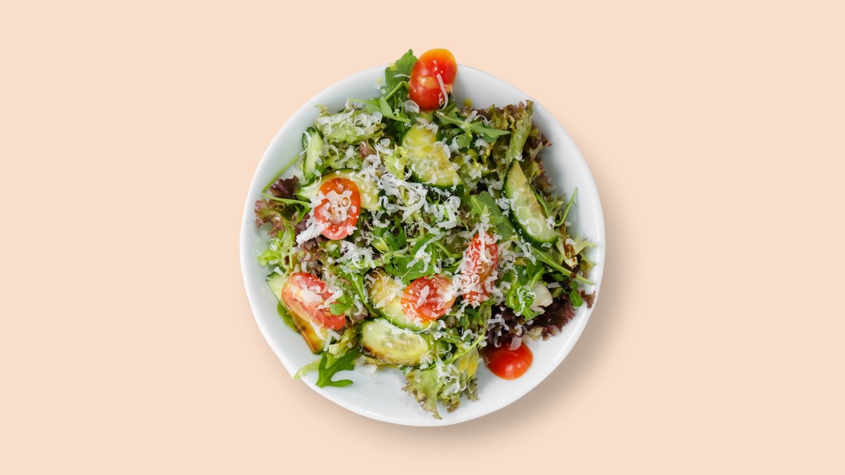 Gurken, Tomaten, hausgemachtes Dressing und Parmesan