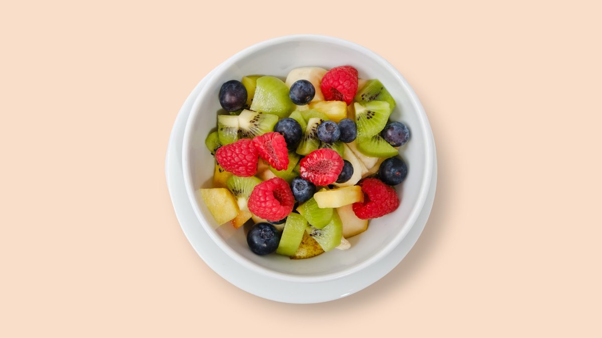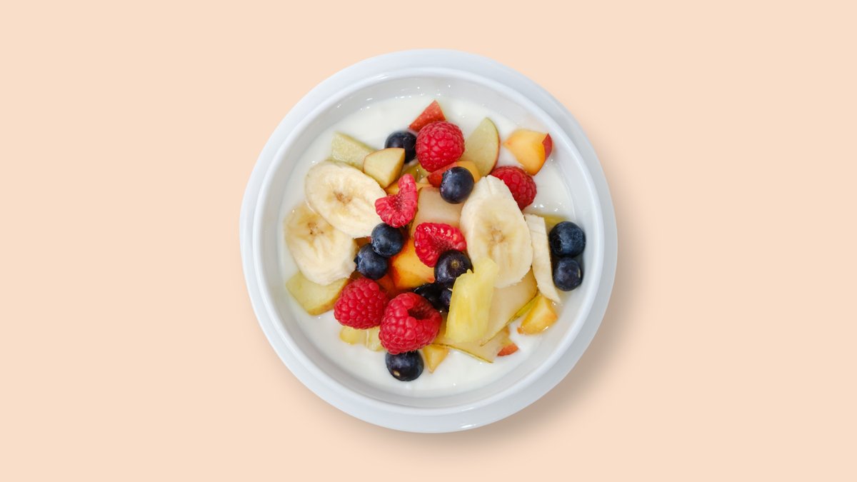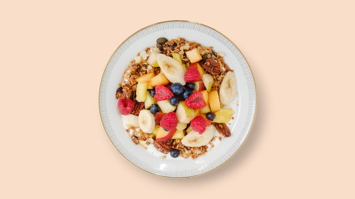 Quinoa, Hafer, Cranberry, Kürbis und Pekannüsse, dazu Joghurt und frischer Obstsalat