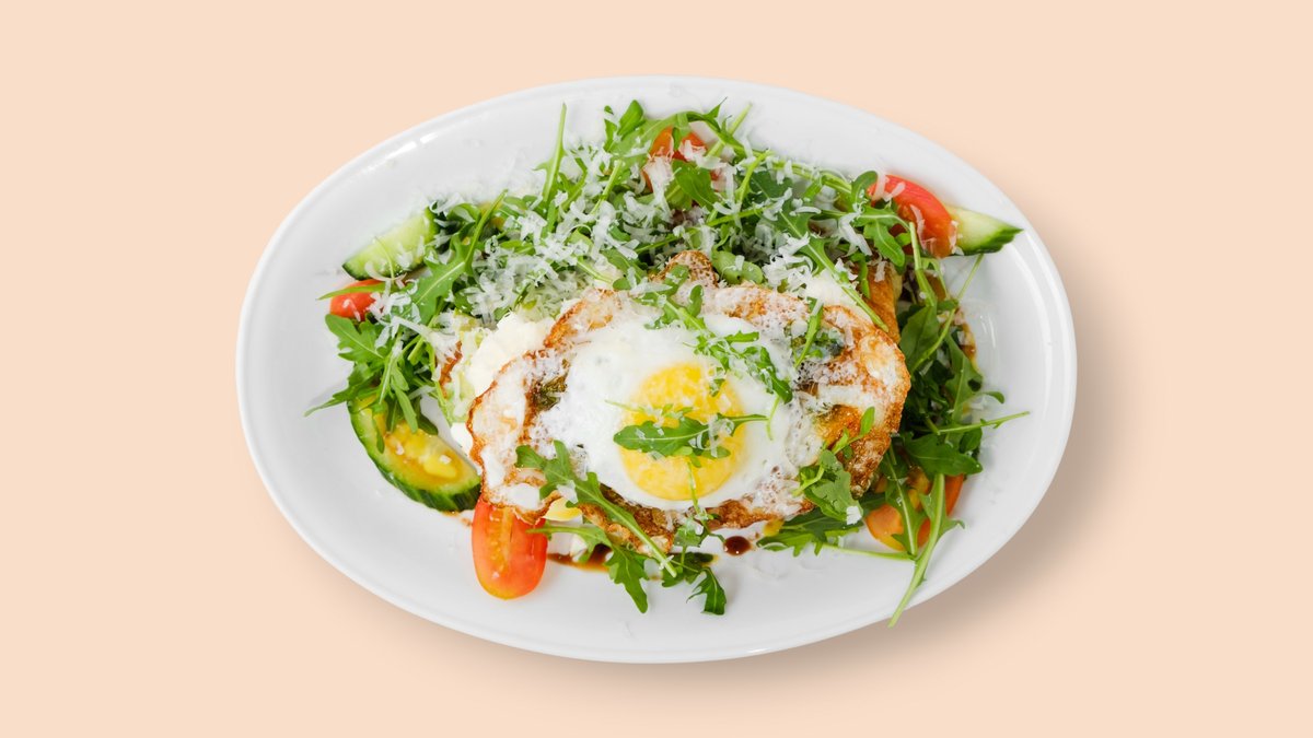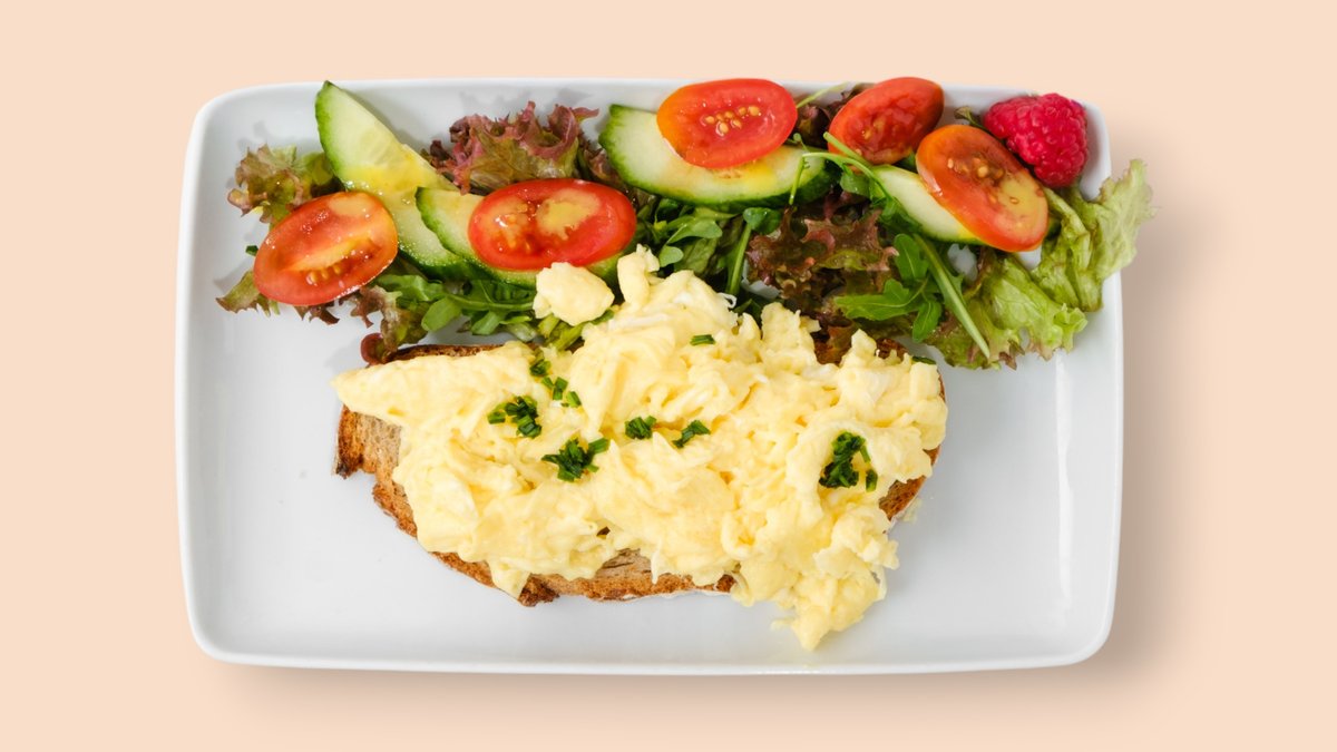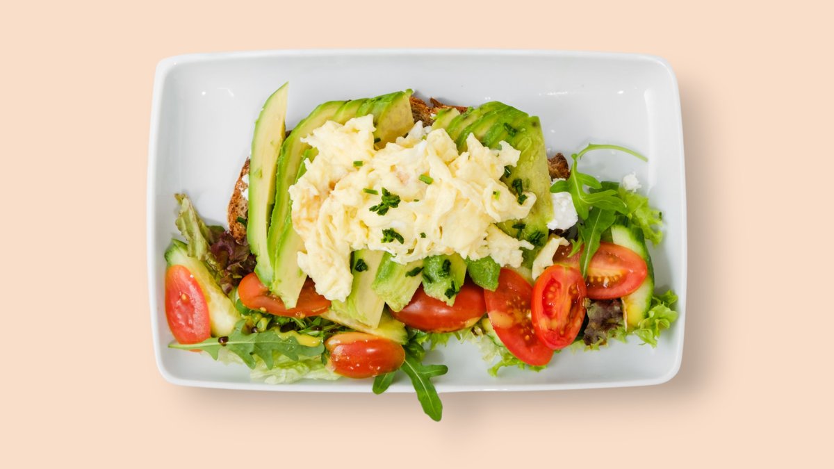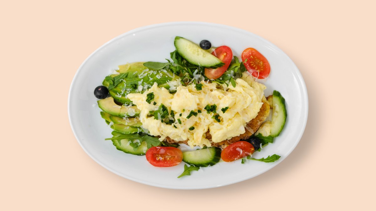 Landbrot mit Ei-Parmesan-Hülle, Avocado und Butter-Rührei
