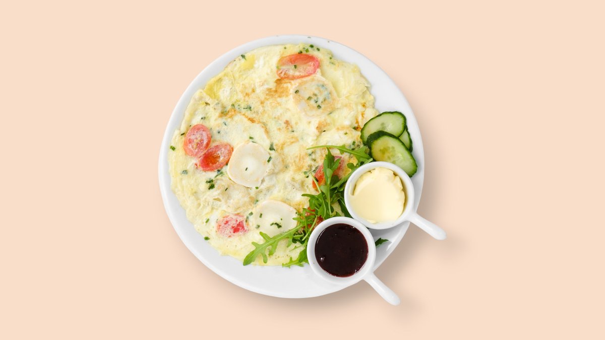 Omelette mit Tomaten, Butter und Marmelade, dazu Brot und Baguette