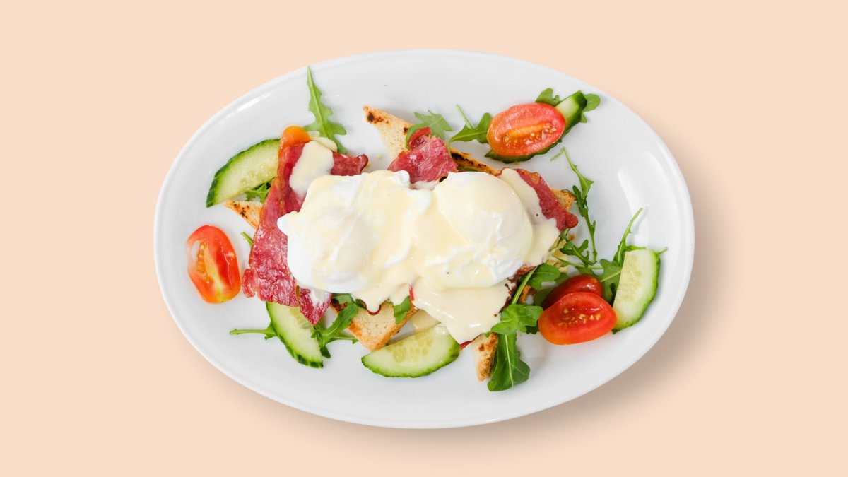 pochierte Eier auf Brioche mit Speck vom Rind, Avocado und Sauce hollandaise
