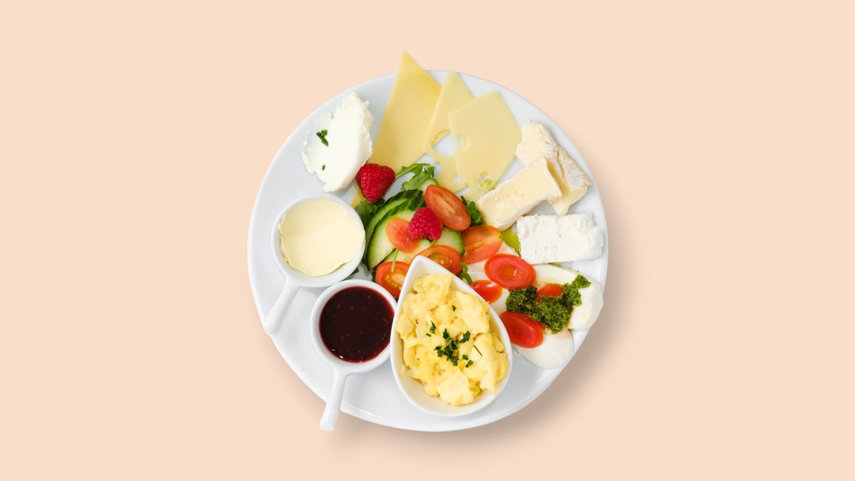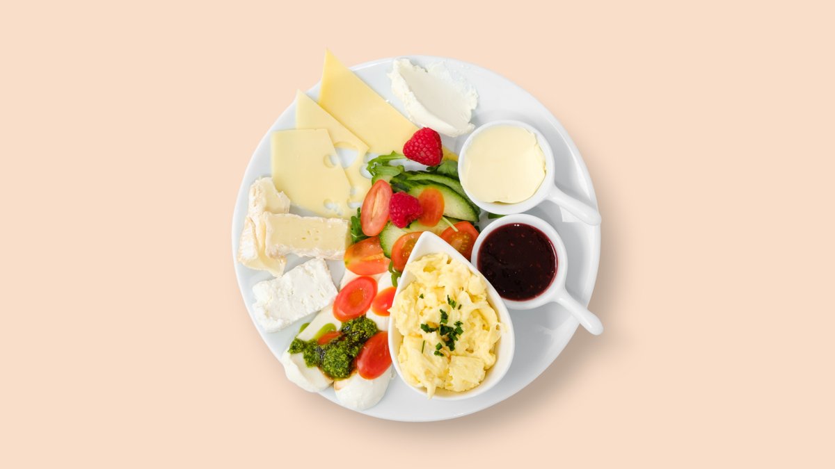 Käse, Aufschnitt, Lachs, Marmelade, Butter, ein Ei deiner Wahl und Obstsalat