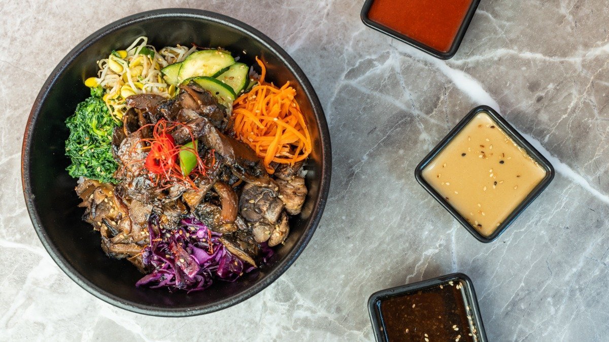 mit Reis, Kimchi, Spinat, Karotten, eingelegtem Rettich, Sesam und Kimchi-Mayonnaise