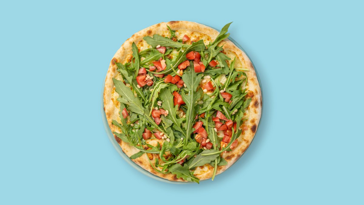 mit Mozzarella, Hirtenkäse, Pinienkerne, Rucola, Cherrytomaten und Oregano