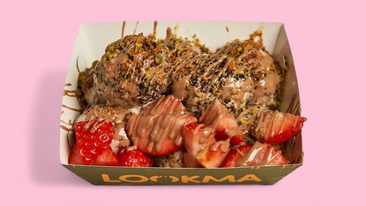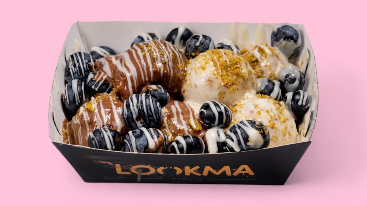 mit Vollmilchsoße, Haselnusskrokant, gemahlenen Oreo, Snickers, Bueno Riegel und Erdbeeren