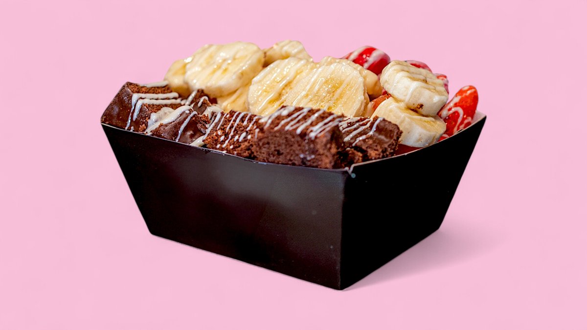 Mit weißer Schokoladensauce, klein gehackten Brownie Stücken, Erdbeeren, Bananen, Vollmilch und weißer Schokoladensauce.