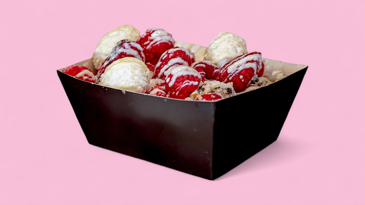 mit Raffaello-Füllung, Kokosflocken, gemahlenem Oreo, gesplitterten Mandeln, Erdbeeren und weißer Schokoladensoße Das Gericht wurde mit Schokolade zubereitet und kann Spuren von verschiedenen Nüssen enthalten