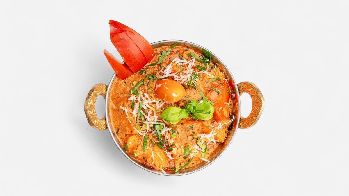 Hähnchenbrustfilet gewürfelt, zubereitet in Ghee (geklärte Butter), in feinem Tomaten-Sahne-Curry, angemacht mit Cashew-Safranpaste, mit Paneer, Mandeln und Fruchtstückchen