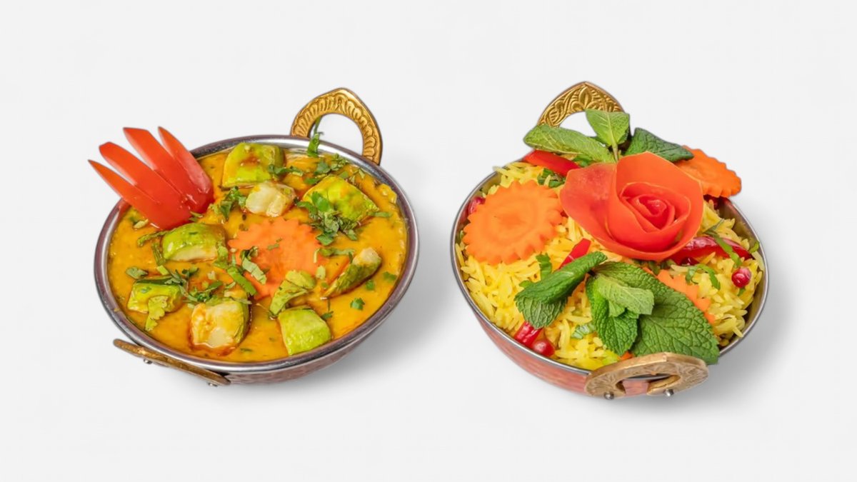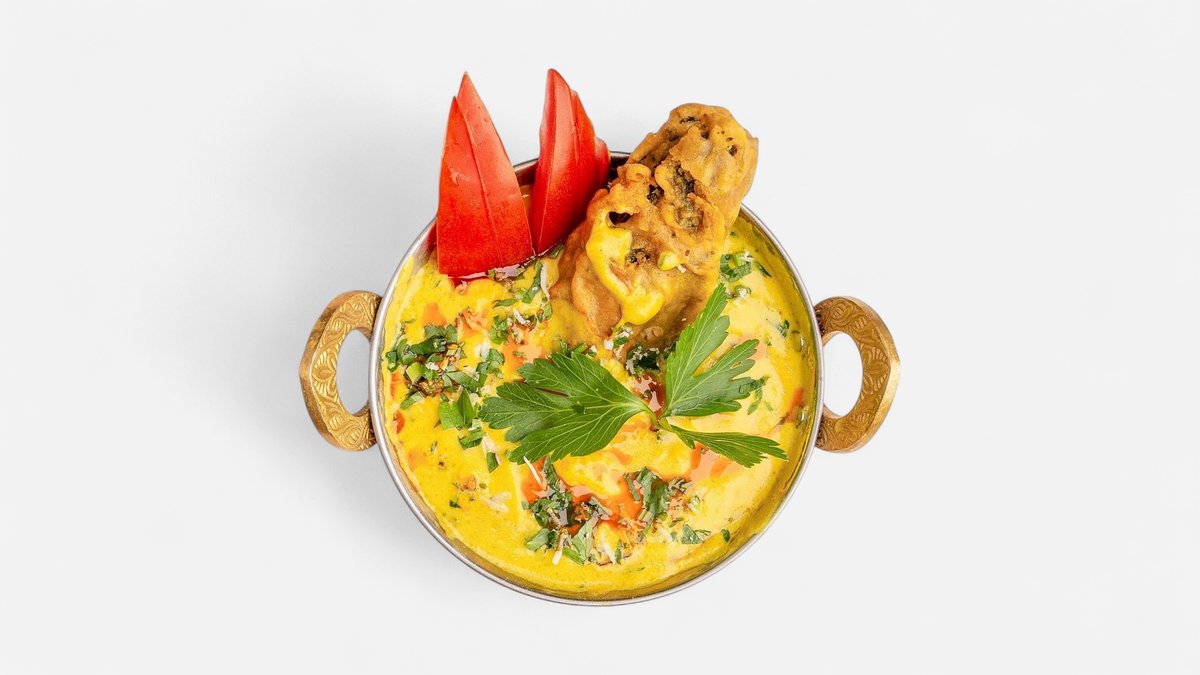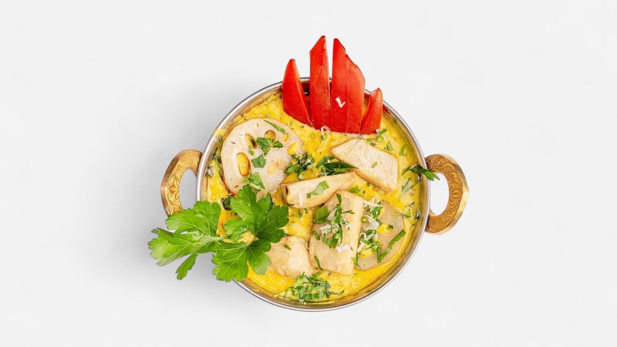 leicht süßliche indische Auberginen und Kartoffelstückchen, mit gebratenem Gemüse und gemahlenen Cashewnüssen, serviert in Kadhi-Soße
