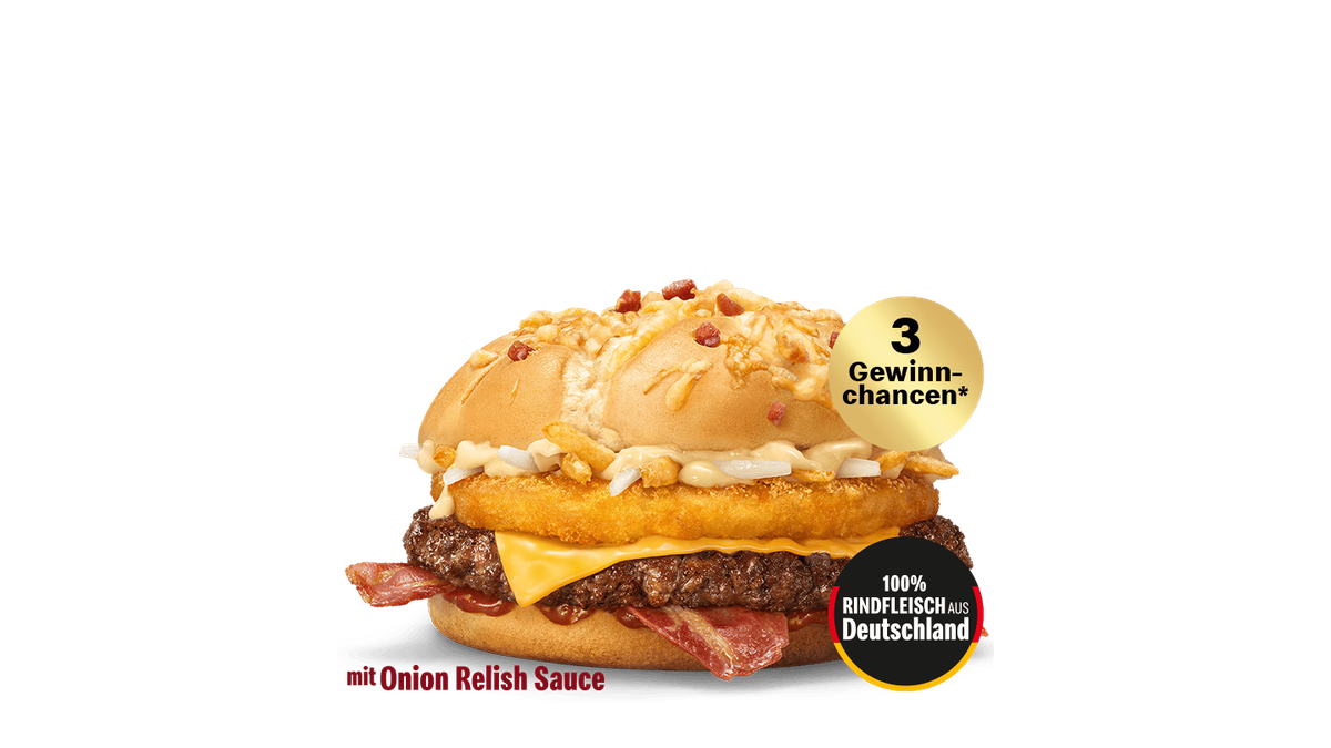 Wie wär’s mit Big Rösti aber Käsespätzle Style: Der Big Rösti Käsespätzle Style mit 100 % saftigem Rindfleisch aus Deutschland, goldgelbem Rösti-Patty – und erstmals cremig-würziger Käsespätzle-Style Sauce. Dazu zartschmelzender Cheese, knusprige Röstzwiebeln, cremige Big Rösti-Sauce und ein extra fluffiges Bacon-Cheese-Bun obendrauf. So cremig war der Big Rösti noch nie. Winterzeit ist Rösti-Zeit. + 3 Gewinnchancen - Solange der Vorrat reicht!