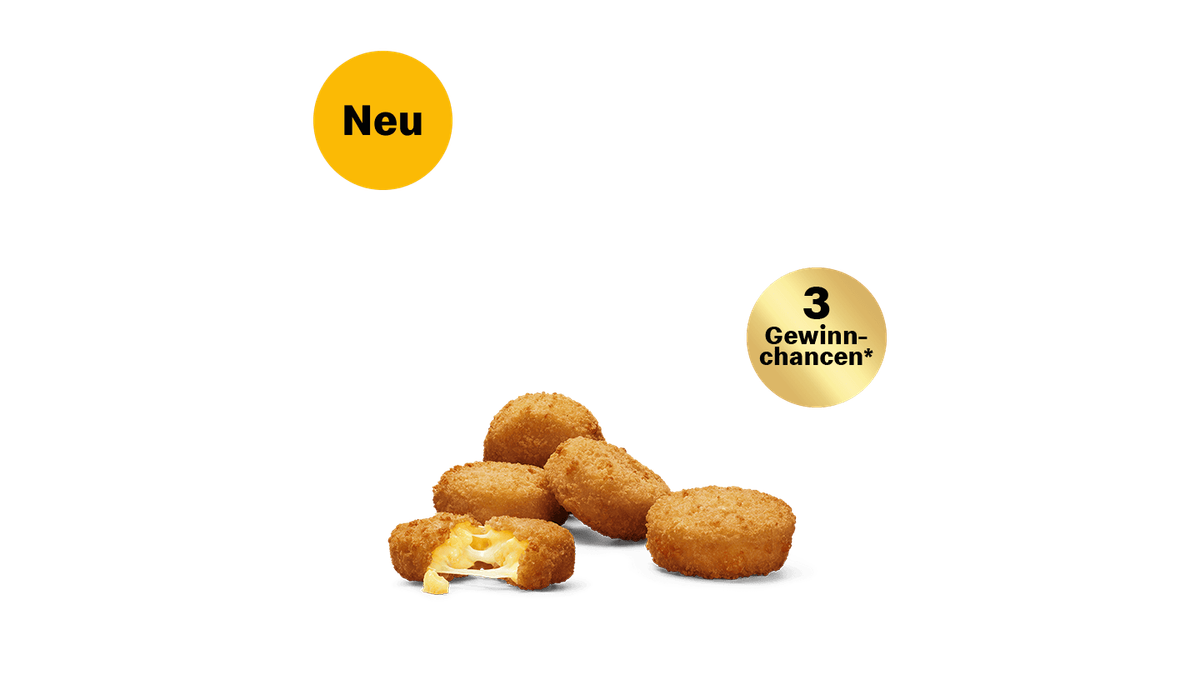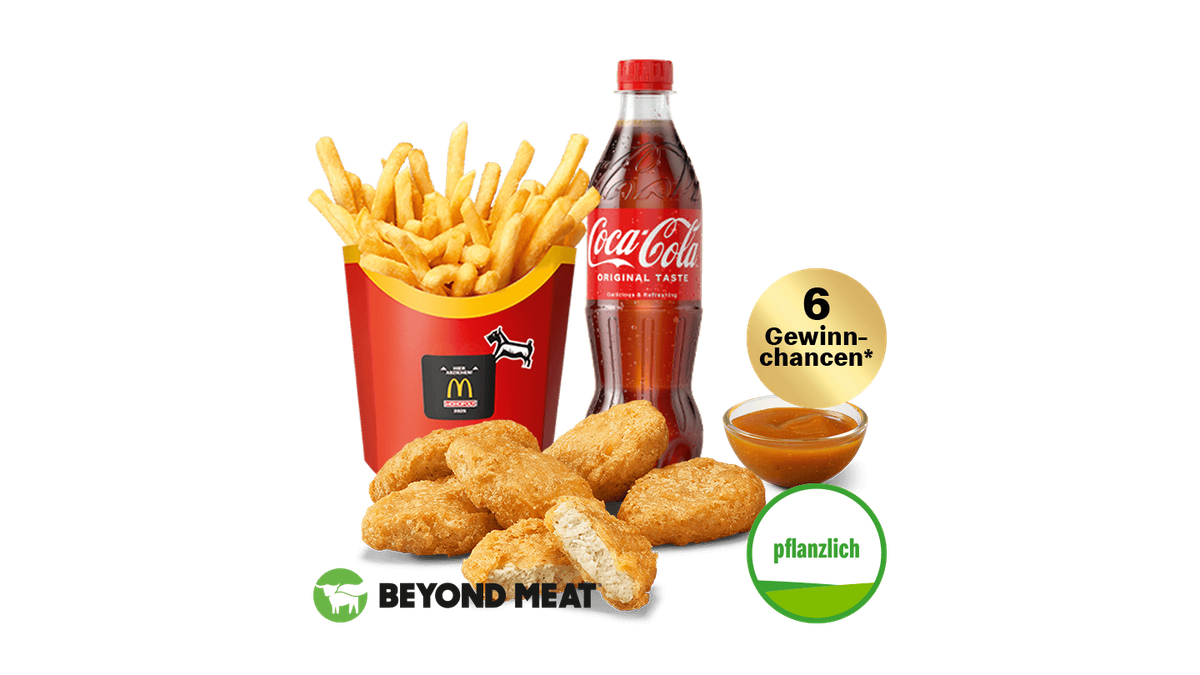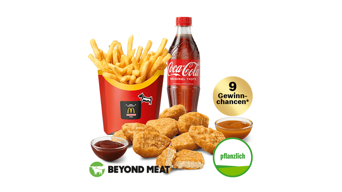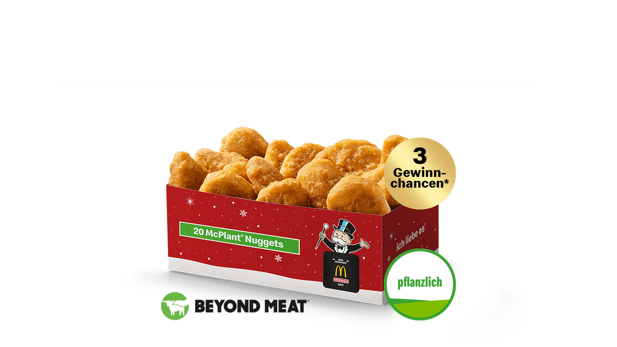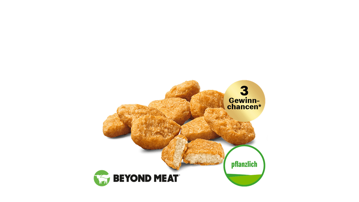 Probiere jetzt mal unsere neuen McPlant® Nuggets auf Basis von Weizen- und Erbsenprotein (kann in der Küche in Kontakt mit Hähnchenprodukten gekommen sein). Außen knusprig und innen herzhaft-saftig. Echter McDonald's Geschmack zum Teilen und Dippen. Beyond Meat® and the Beyond Meat logo are registered trademarks of Beyond Meat, Inc. + 3 Gewinnchancen - Solange der Vorrat reicht!