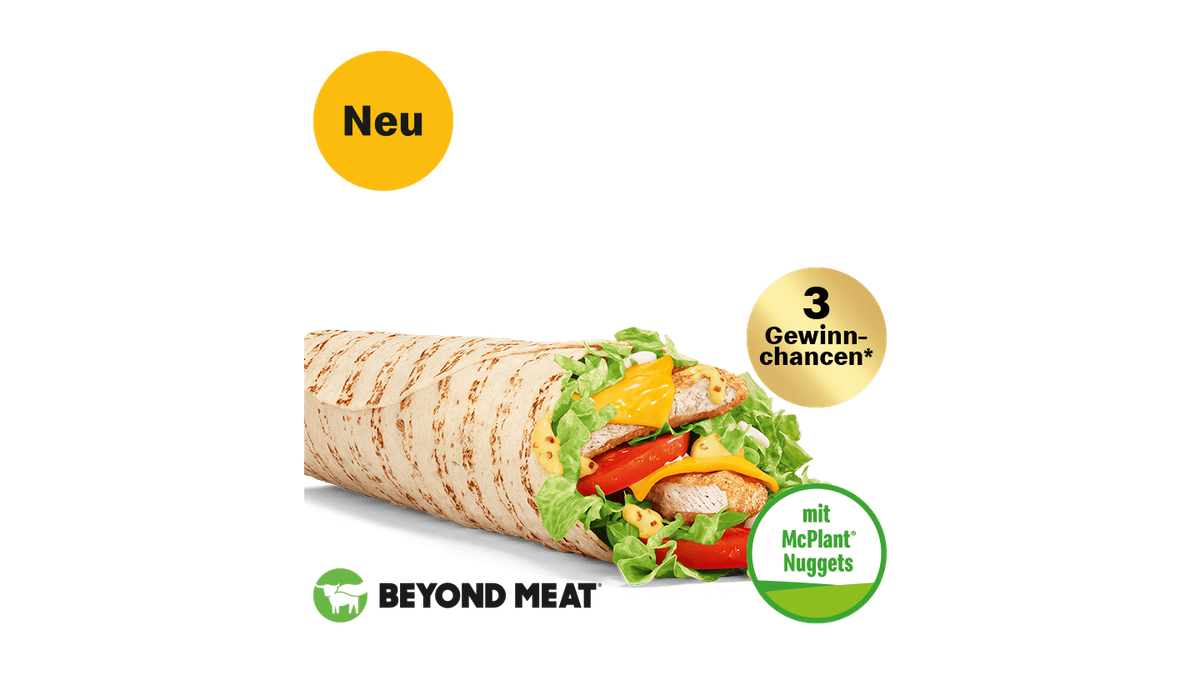 Jetzt NEU: Tausche Chicken gegen McPlant® Nuggets. Probiere jetzt unseren McWrap® Plant Nuggets Honig-Senf. Eine Weizentortilla, gefüllt mit knusprigen McPlant® Nuggets (kann in der Küche in Kontakt mit Hähnchenprodukten gekommen sein), knackigem Eisbergsalat und saftigen Tomaten. Dazu eine Scheibe zartschmelzender Cheese (enthält Milchprodukte) und die unwiderstehliche Kombination aus würziger Honig-Senf (enthält Eiprodukte)- und einer cremig-milden Sandwich-Sauce. Eingerollt und ready to go! - + 3 Gewinnchancen - Solange der Vorrat reicht!