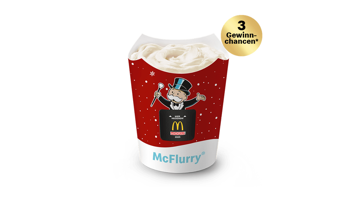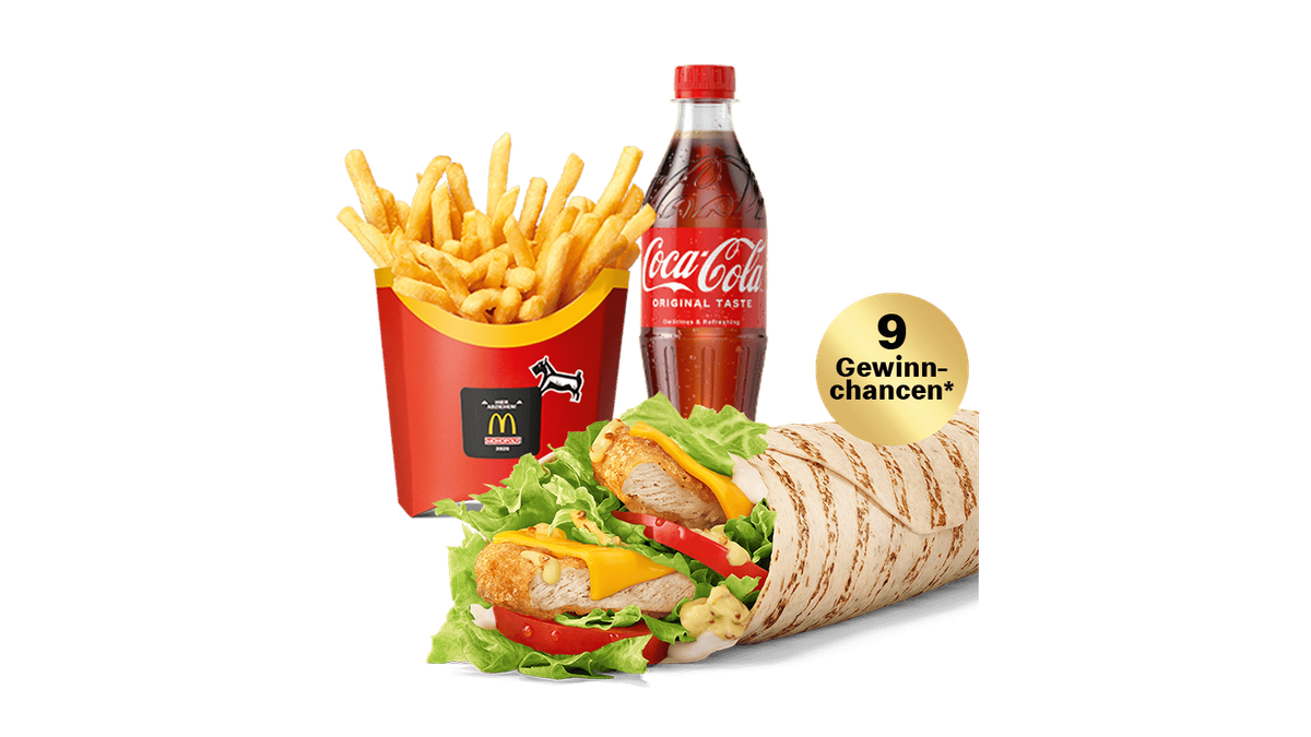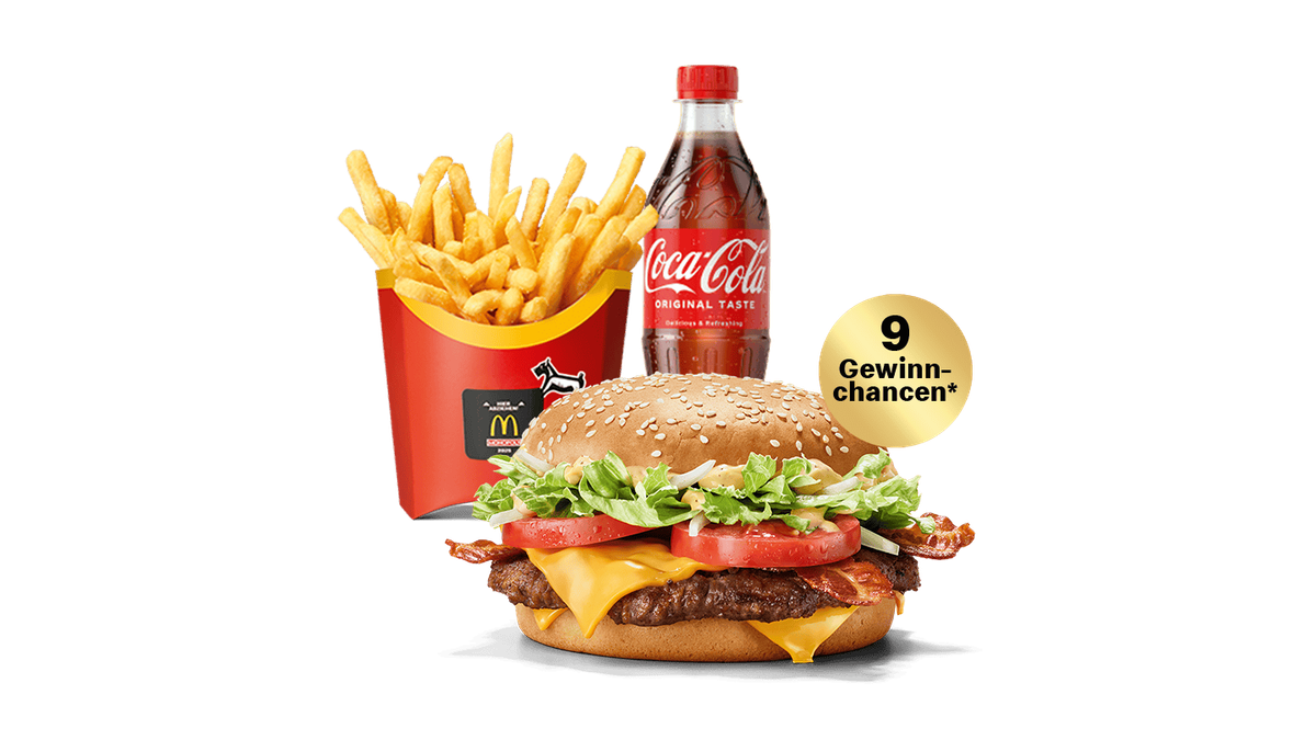 1 Klassiker + 1 Beilage + 1 Getränk. Bei Auswahl pfandpflichtiger Getränke erhöht sich der Endpreis um das Pfand (+ 0,25 € EINWEG). Infos zu Allergenen u. Zusatzstoffen siehe jew. Einzelprodukt der Kategorien Burger, McNuggets oder McPlant. + 9 Gewinnchancen - Solange der Vorrat reicht!