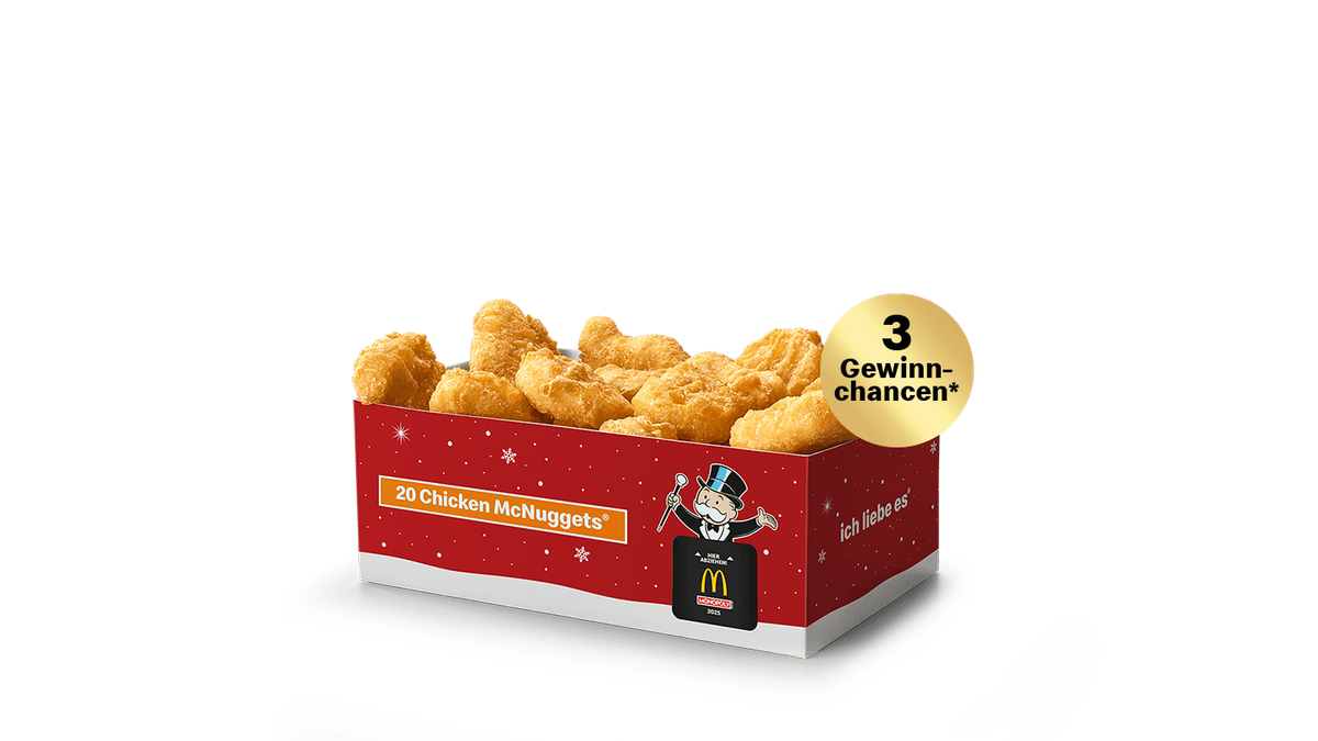 Für Chicken-Liebhaber: Unsere 20er Box gefüllt mit knusprigen Chicken McNuggets® kann wirklich jeden Hunger stillen, also ran an die Chicken McNuggets® mit 100 % Hähnchenbrustfleisch! + 3 Gewinnchancen - Solange der Vorrat reicht!