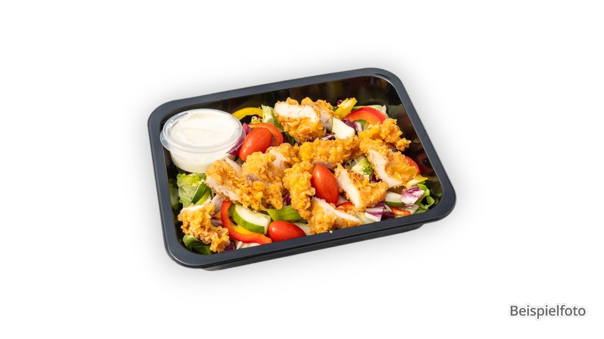 großer gemischter Salat mit gegrillten Hähnchenbrustfiletstreifen, dazu Knoblauchbrot