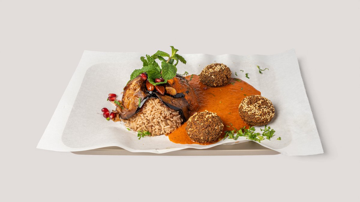 gewürzter Reis mit Aubergine, Datteln, Nussmix und pikanter Matbucha-Soße
