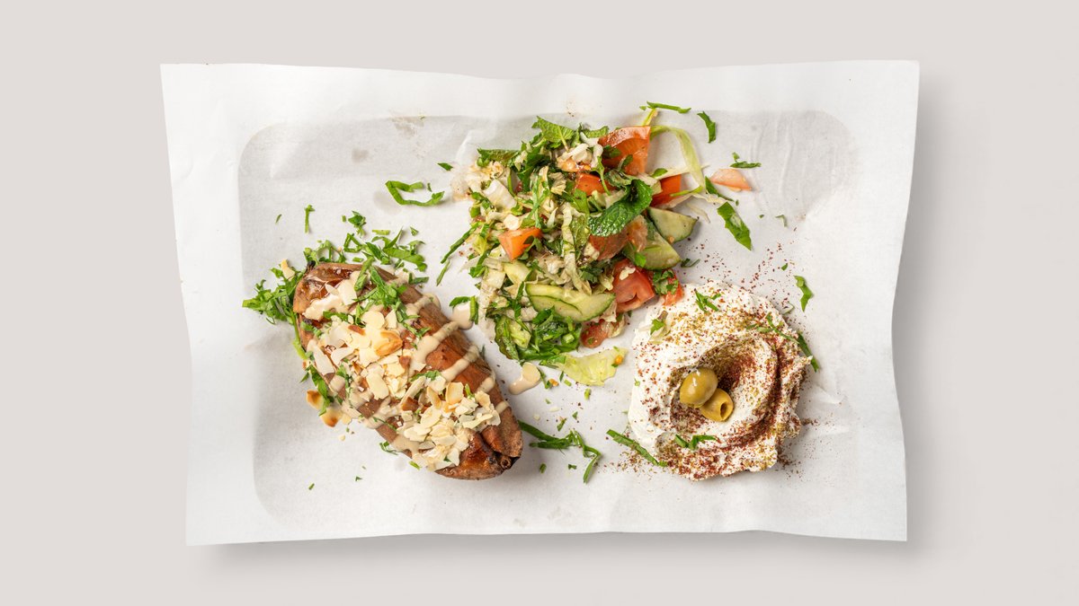 mit Chermoula-Marinade, Labneh Dip, krunsprigen Kichererbsen, Mandeln und Hasselback Potato