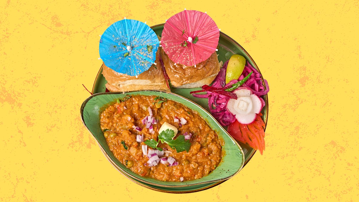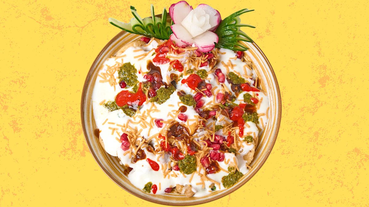 knusprige Mumbai Vegetable Samosa, Weizen-Grießtaler mit Kichererbsen, Zwiebeln, süßem Joghurt, Koriander-Minz-Soße, Tamarinde.Soße, Tomatensoße, Koriander, Bhujia, Granatapfelkernen und Rote Beete