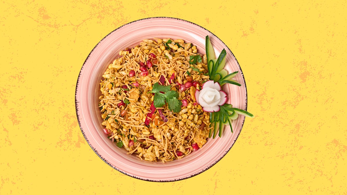 mit Tomaten, Zwiebeln, Granatäpfeln, Koriander-Minz und Tamarinde Chutney Bhel Puri