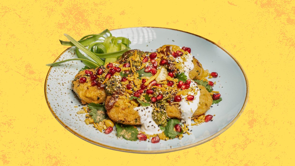 3 Stück würzige Kartoffel-Patty mit süßem Joghurt, Koriander-Minz-Soße, Tamarinde-Soße, Tomatensoße, Koriander, Bhujia, Granatapfelkernen und Rote Beete