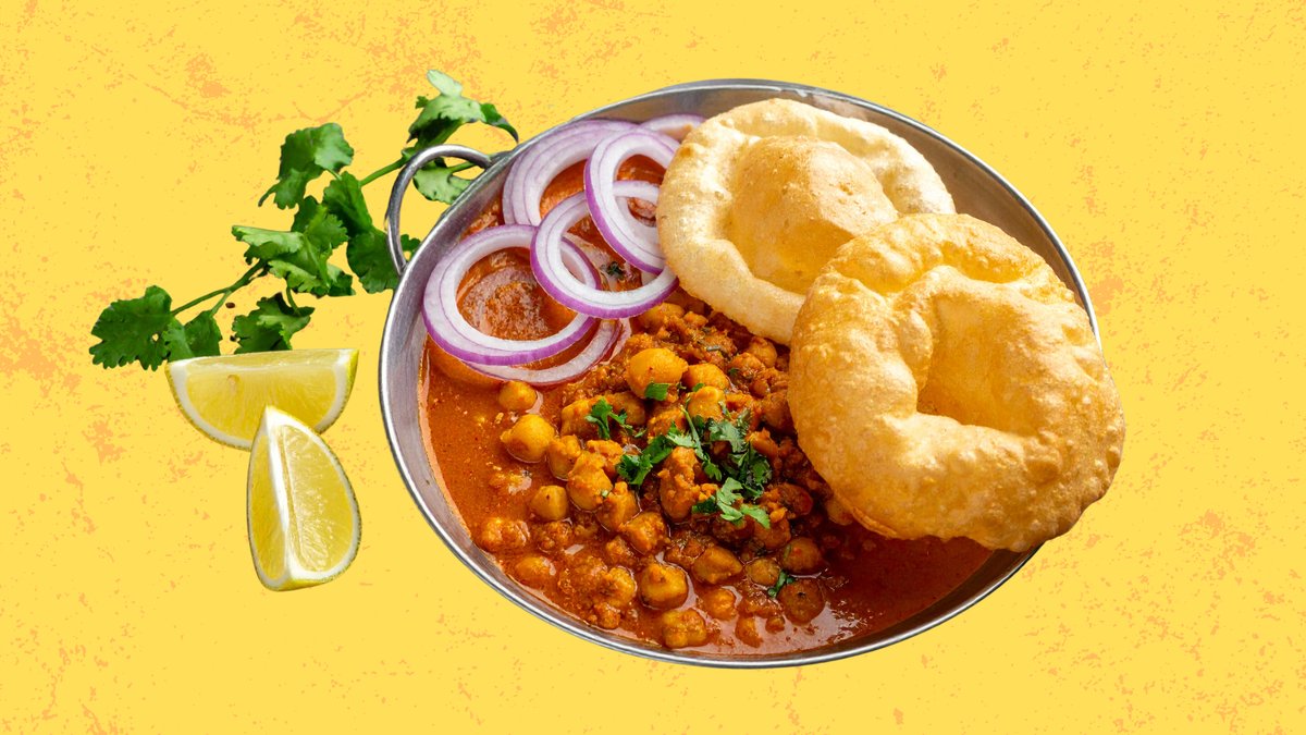 pikantes Kichererbsencurry nach Punjabi-Art, serviert mit zwei frisch frittiertem Bhatura (Weizenfladen)