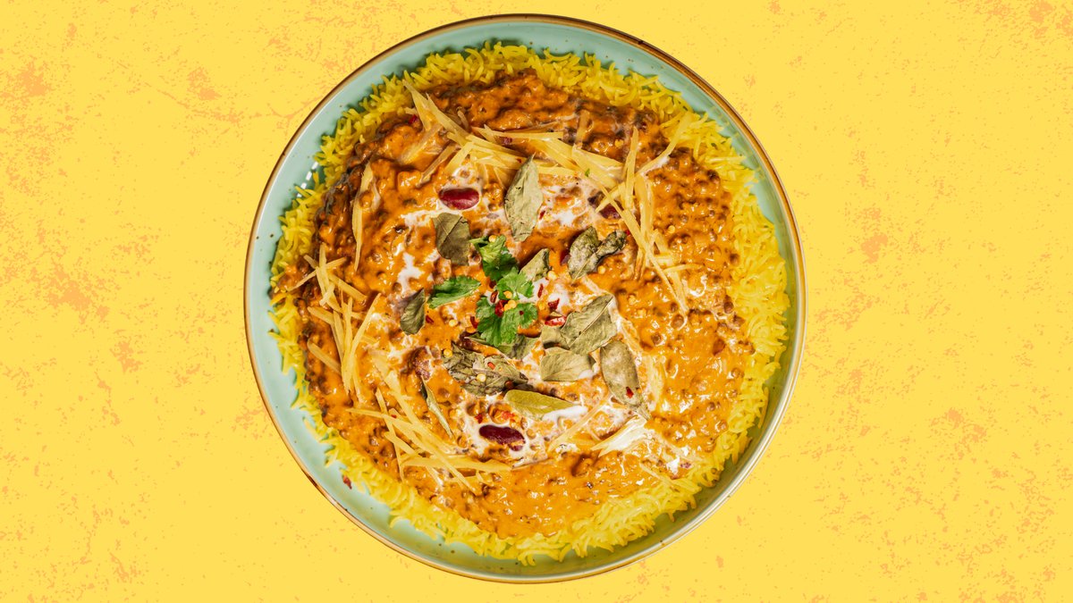 gebratener Reis mit Mandeln, Cashewkernen, Rote Beete und exotischen Gewürzen, dazu Raita und Chutneys und einer Zutat deiner Wahl