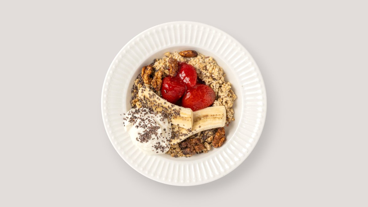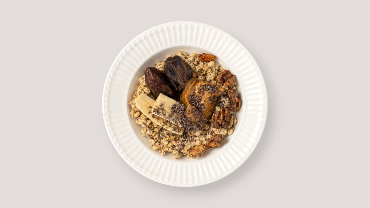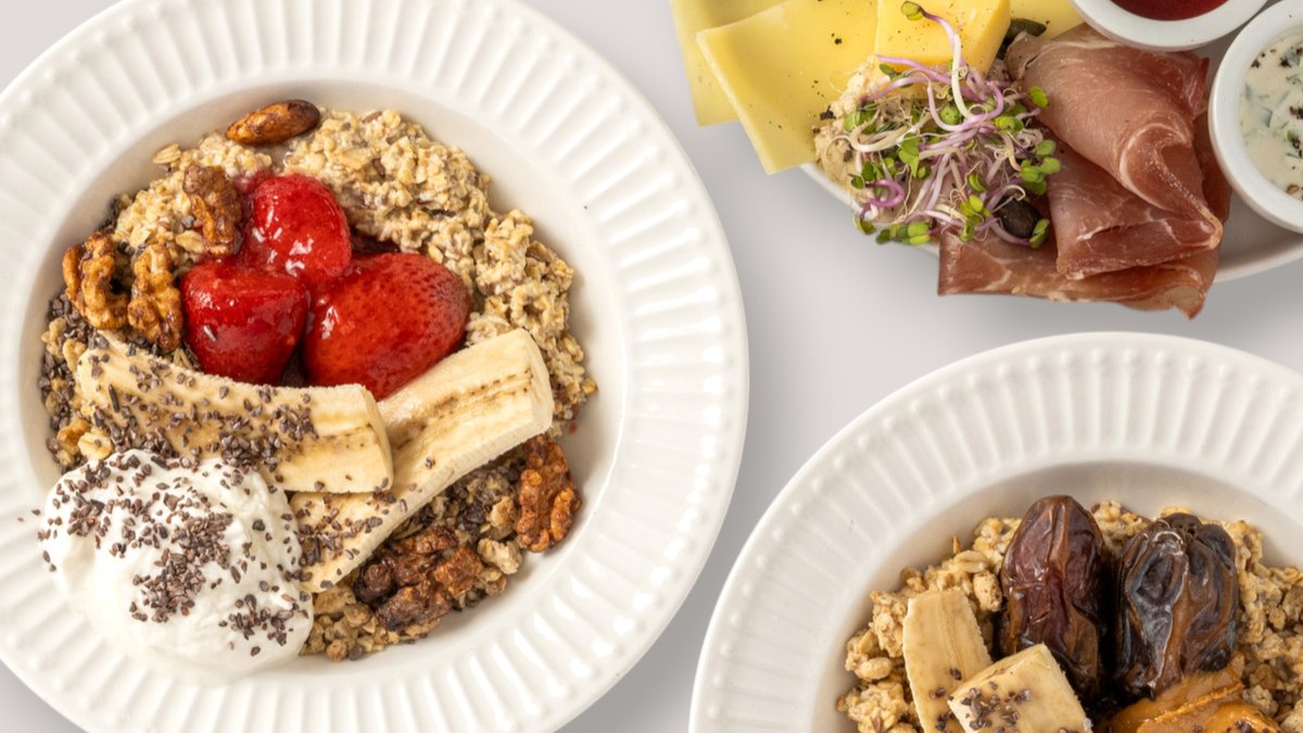 alle Gerichte werden mit Haferflocken, Leinsamen, Chiasamen, Haferdrink, Vanille, Zimt, Banane, Granola und Kakaonibs zubereitet