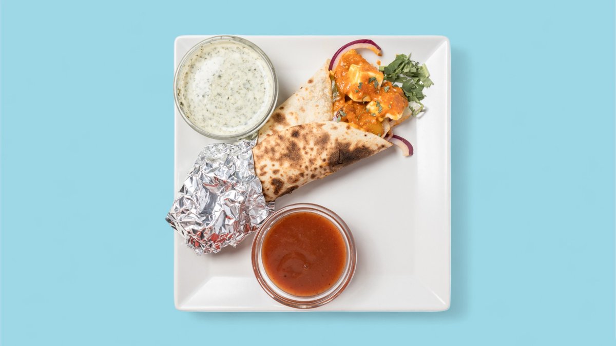 gefüllt mit Kichererbsen-Curry, eingelegten Zwiebeln, Koriander und Chutney-Soßen