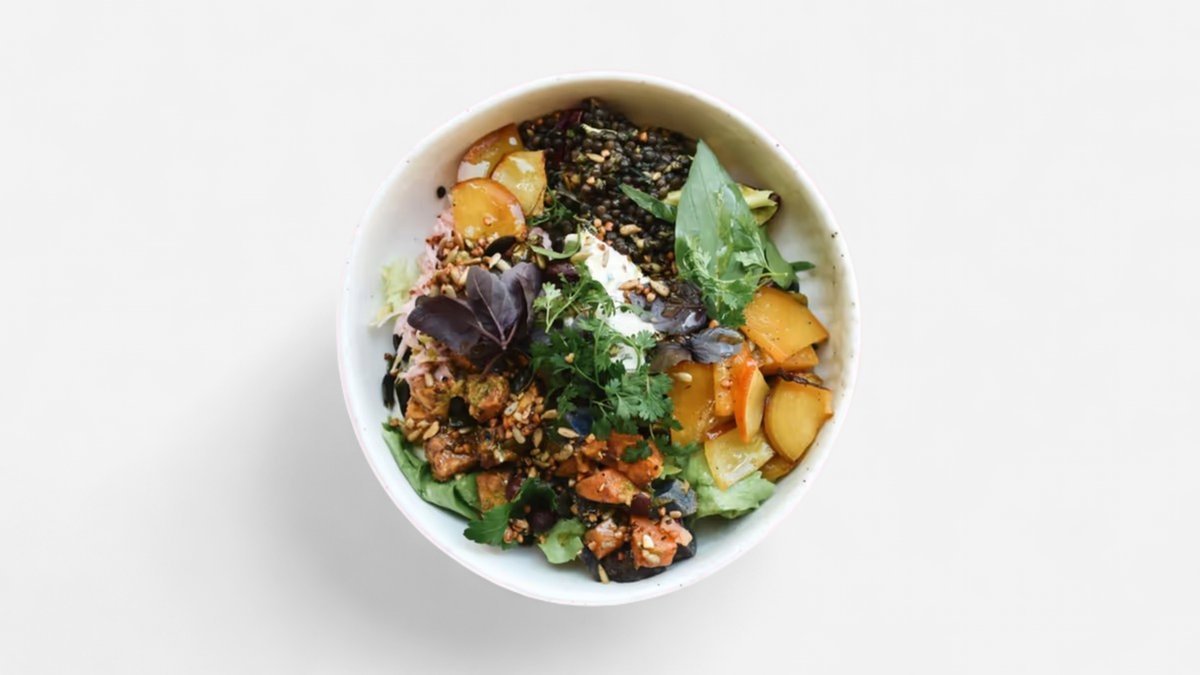 mit Blattsalat, Belugalinsen, Süßkartoffel, Coleslaw, Kräuterquark, herzhaftes Granola, Kräuteröl