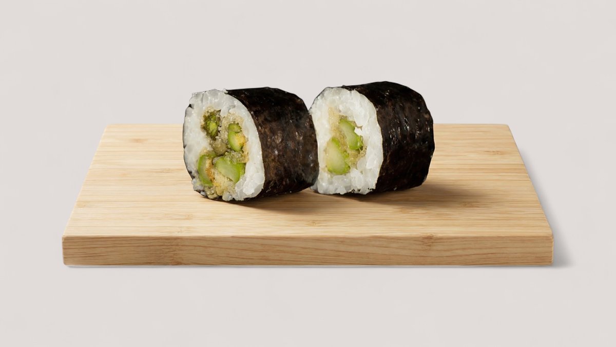 knuspriger Tempura-Spargel, eingerollt in Sushi-Reis und Nori, verfeinert mit Sesam