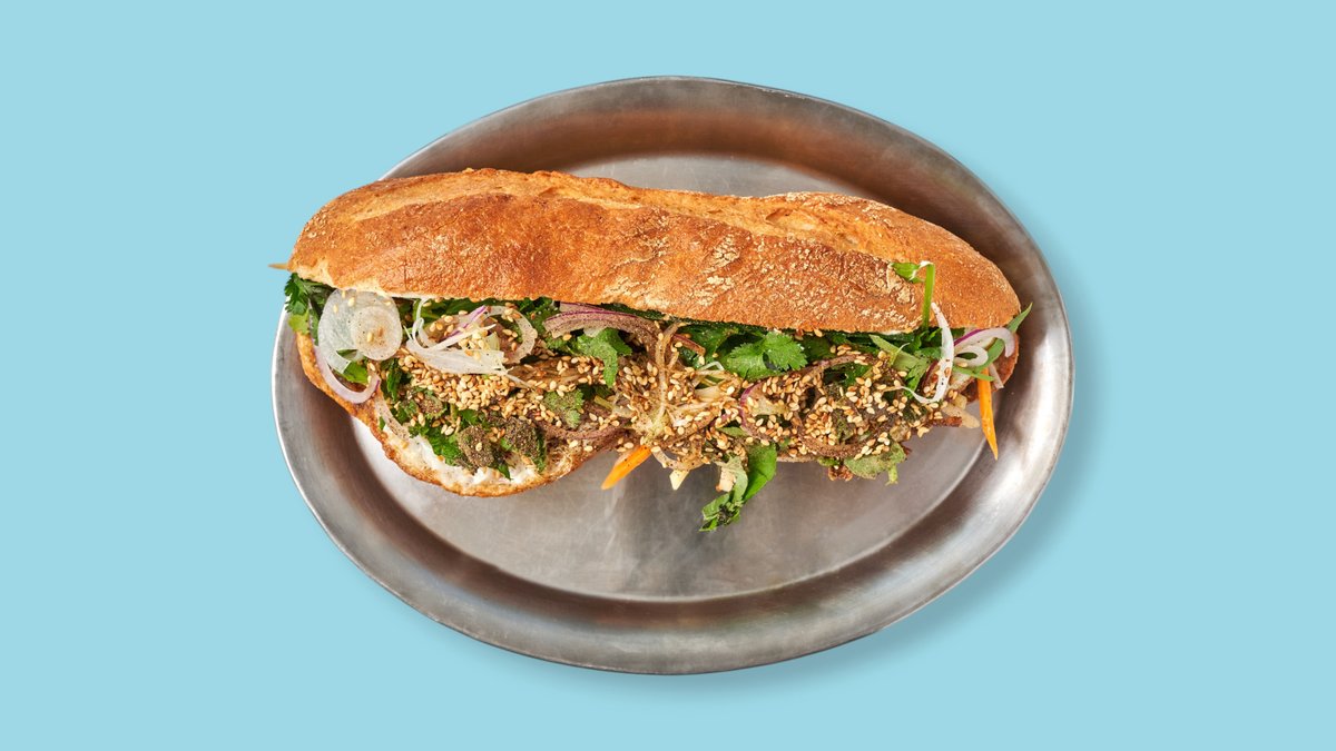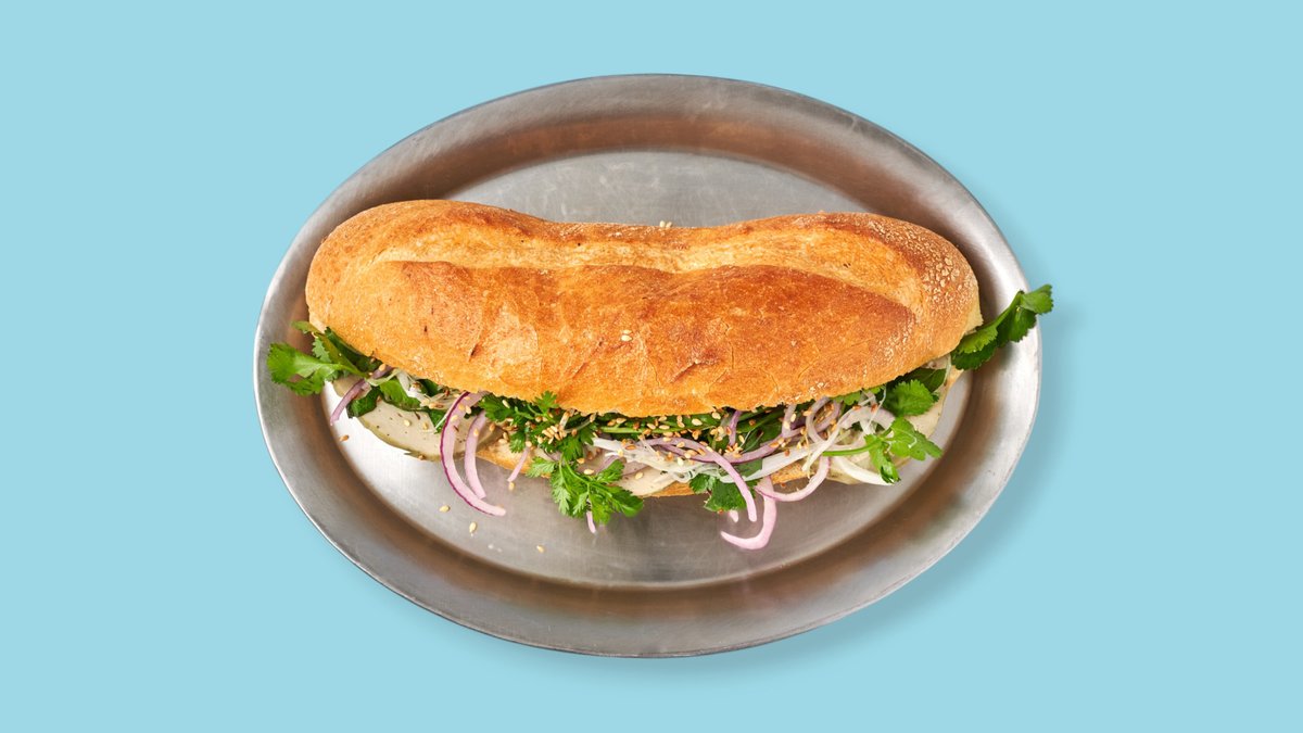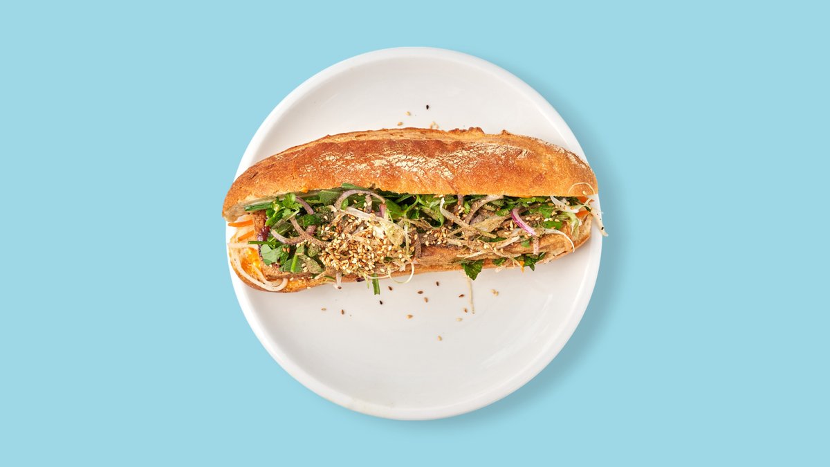 Baguette mit veganer homemade Pate und veganer Mortadella, veganer Chilibutter, veganer Limettenmayo, asiatischen Kräutern, Gurke, Pickles, Rote Zwiebeln, veganer Fischsoße und Sesam