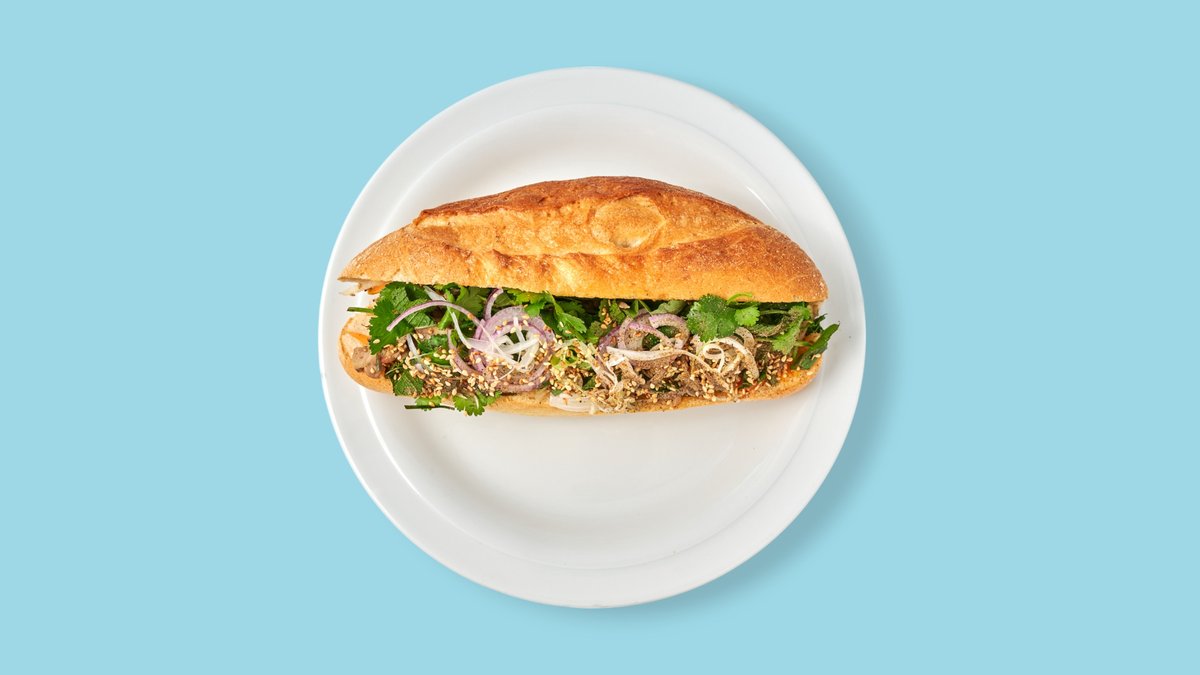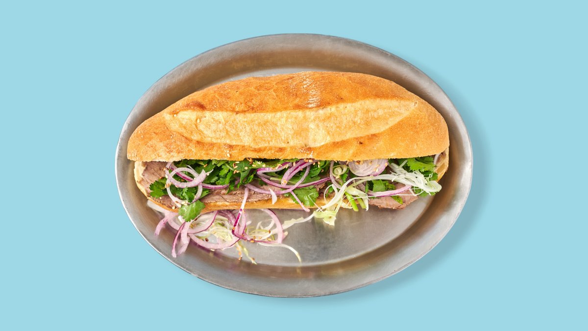 Baguette mit Roastbeef, Limettenmayo, asiatischen Kräutern, Gurke, Pickles, rote Zwiebeln, Fischsoße und Sesam