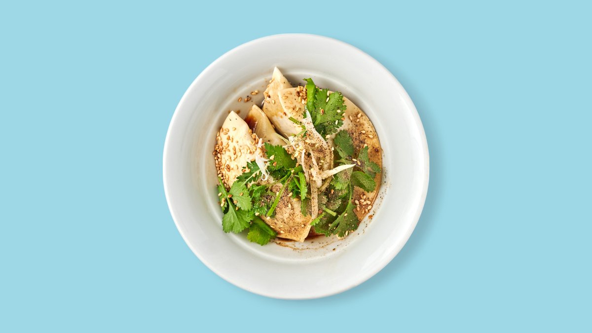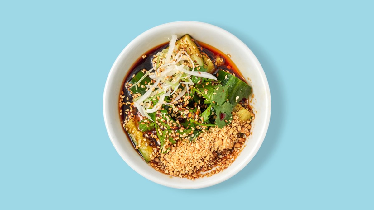 mit Gurken, Weißkohl und Knoblauch in hausgemachter Sojasoße und Sichuan-Chili-Öl
