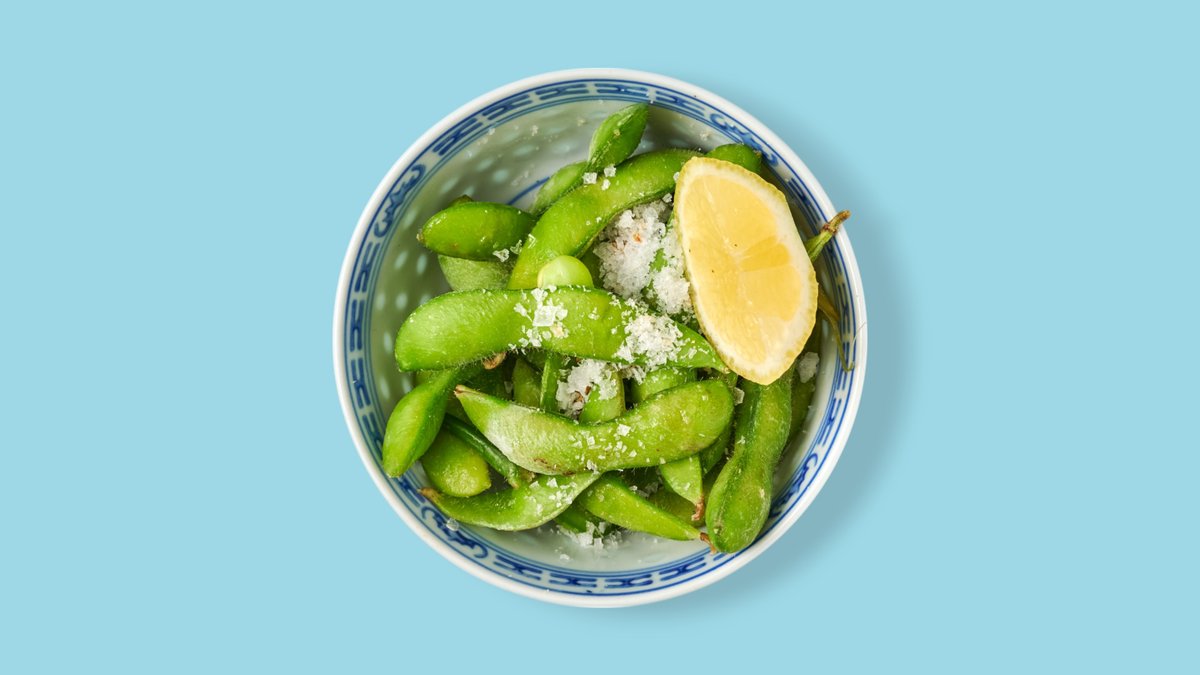mit junge Sojabohnen, Zitronenzeste und Zitronenspalte