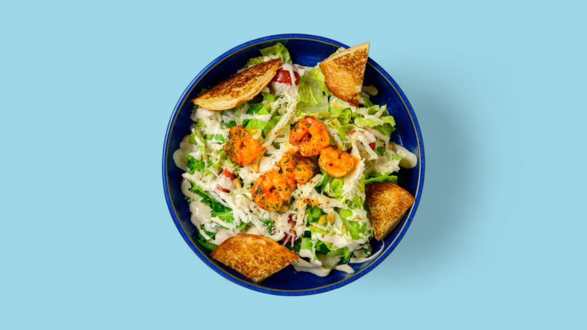 alle Gerichte werden mit Römersalat, Kirschtomaten, Pinienkernen, Knoblauch-Parmesan-Dressing, Parmesan, Kräuterbrioche und Zupfkäse zubereitet