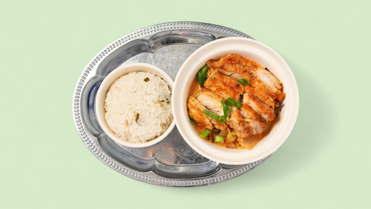Im Ofen Gegrillter Hähnchenschenkel (o. Knochen) in rotem Curry mit Kürbis, Pakchoy, Brokkoli, Zwiebeln und Reis
