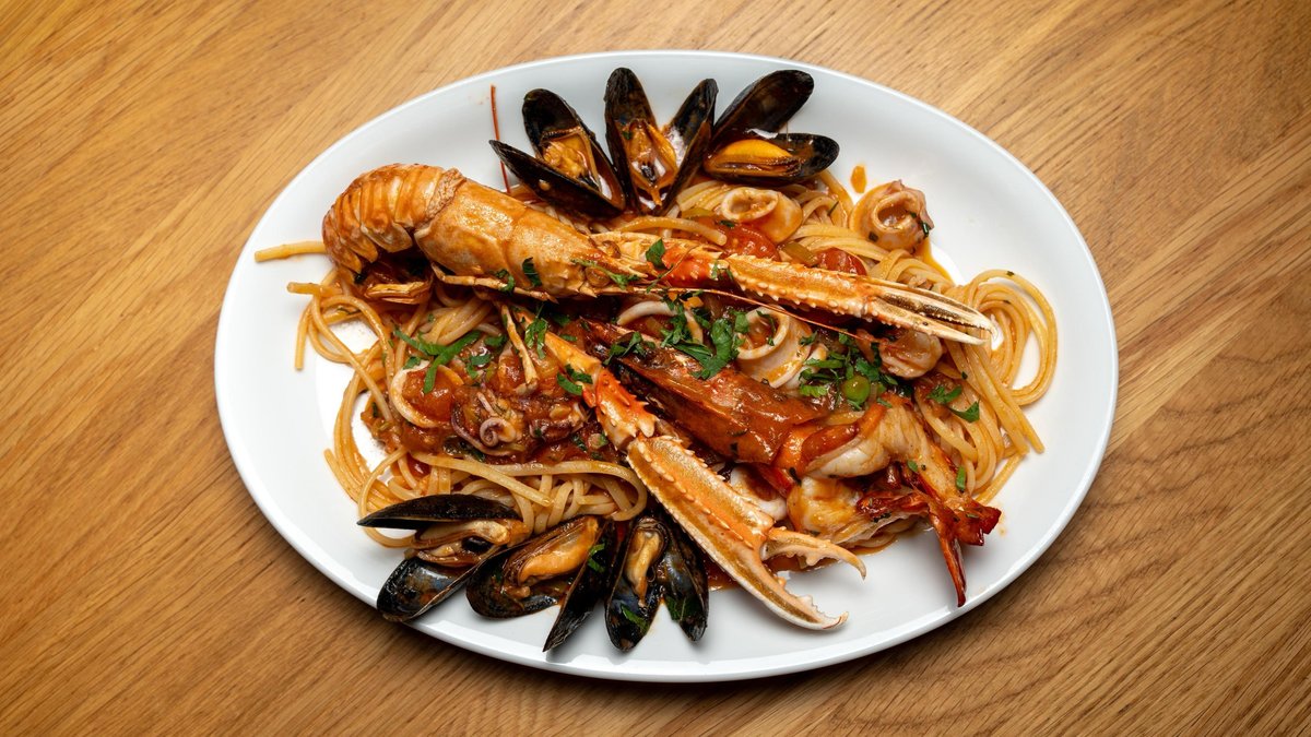 with Norway lobster, king prawns, baby calamaretti and mussels