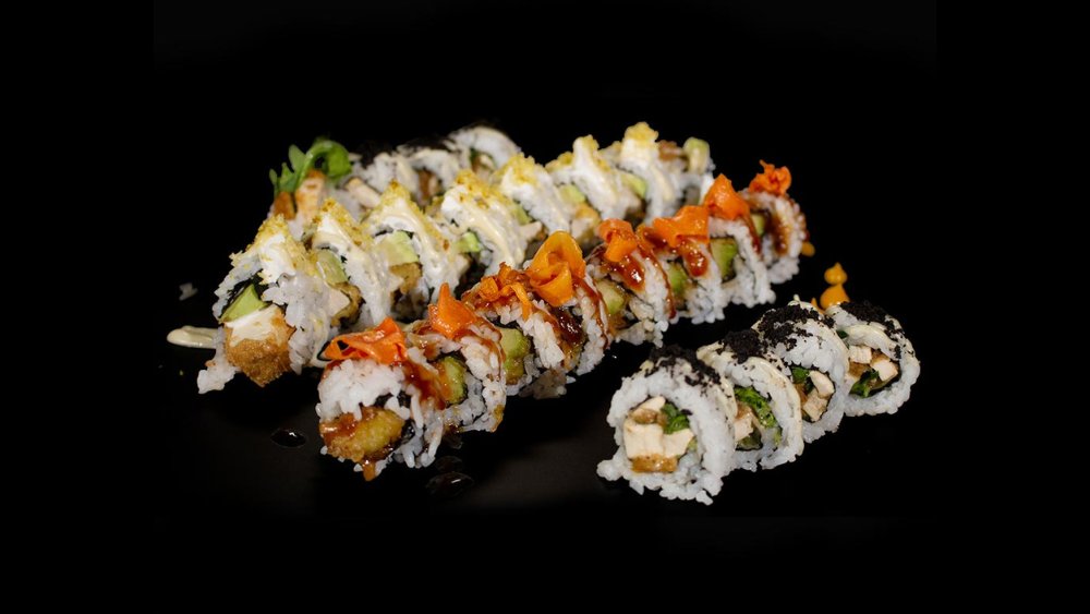 mit Kräuterseitlingen, veganem Avocado-Tempura, veganer Teriyaki-Soße und gebackenen Karotten