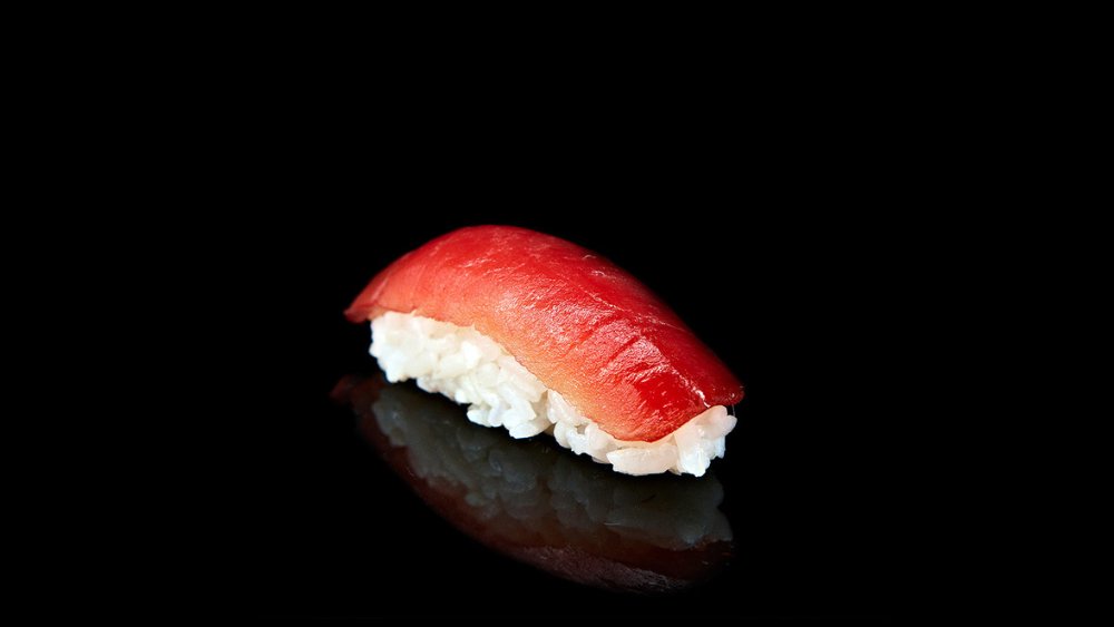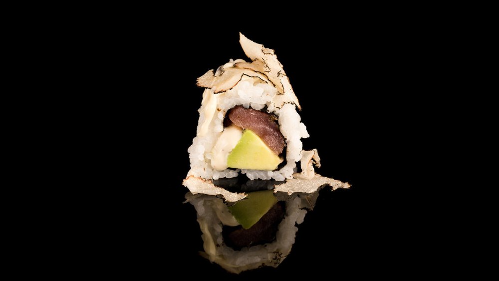 mit Thunfisch, Avocado, Miso-Mayonnaise, Trüffel-Mayonnaise und frischem Trüffel obenauf